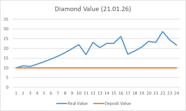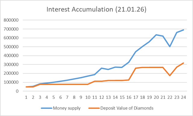 The gap between the deposit value of the diamond reserves and the Money Supply is illustrated in image 8.