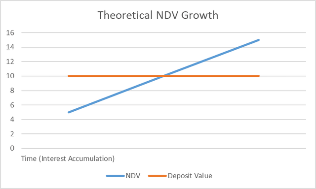 Yes, this is due to many reasons. The main one being that E$ is not meant to be used as way of getting diamonds. Its meant to be a currency used for exchange. And secondly, if the NDV of an account = the deposit value of the account, the interest rate would make the collapse in the case of a bank run or if people decide to sabotage the whole system.