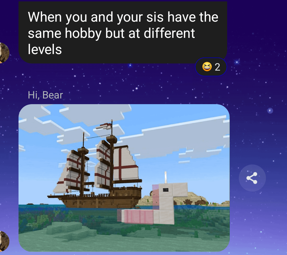 Fooling around in our realm, I decided what we *really* needed was a unicorn floaty in the water. My sister found it when she logged in and shared it with her thoughts in the sibling group chat.