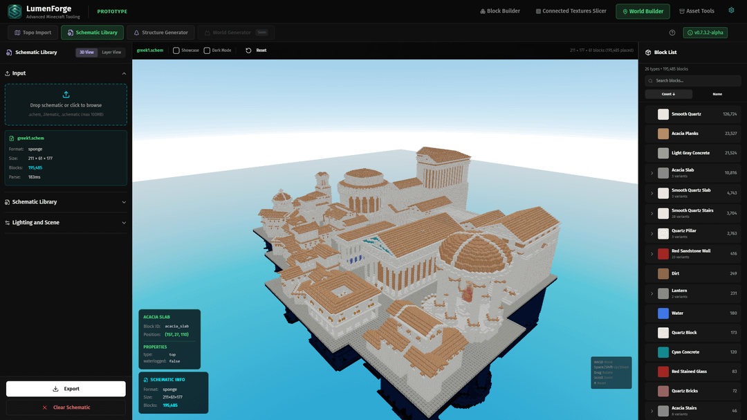 - Build / schematic conversion + inspection (tested across legacy through modern versions — from 1.12.2 up to 1.21.11 — and across common formats like .schem, .litematic, .nbt, legacy .schematic, etc.)