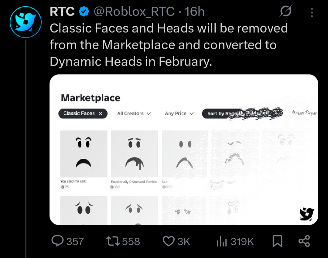 Games suck, avatar items suck, you can’t chat with 75% of players now AT ALL. moderation is hilariously garbage. And now they are removing these badges, which felt like having such a piece of important history. And NOW classic faces?? There is legitimately no benefit to them doing this at all.