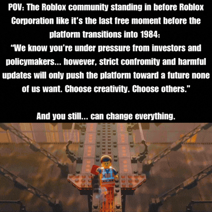 Someone should remix the song and have it pointed at Roblox “Everything is terrible, Everything was cool when you listen to your players” that could be the start of it 😛