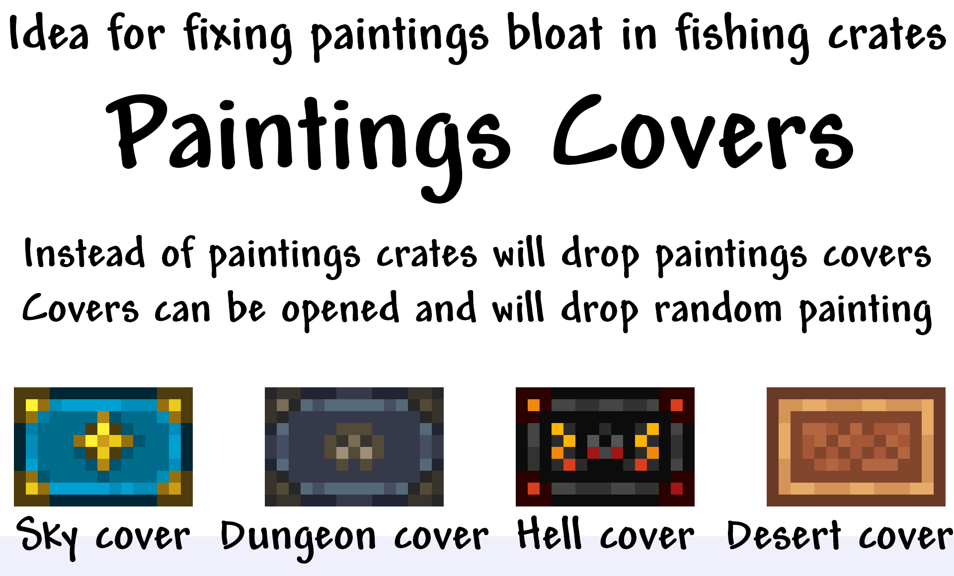 I propose that instead of paintings, crates should drop new items: painting covers, which would work like Christmas presents or goodie bags. That means what you could right-click them to open and receive a random themed painting. This way, paintings could still be obtained from crates, but inventories wouldn’t get clogged with them, and players who don’t need paintings would simply put the obtained covers in a distant chest and open them when necessary