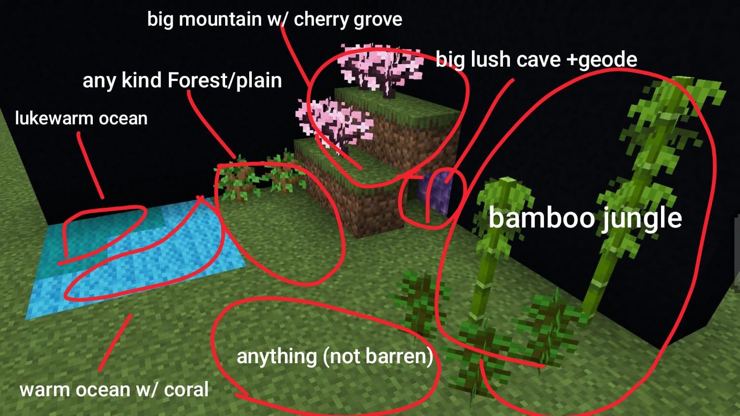 It would be nice if the lush cave was (at least semi) opened towards the water and the biomes not being far apart and not being super far from Spawn. It would also be nice if a village and a spruce Forest was also nearby (or other features/structures), and with a 12-16 render distance the corals were visible. Thanks, and good luck!
