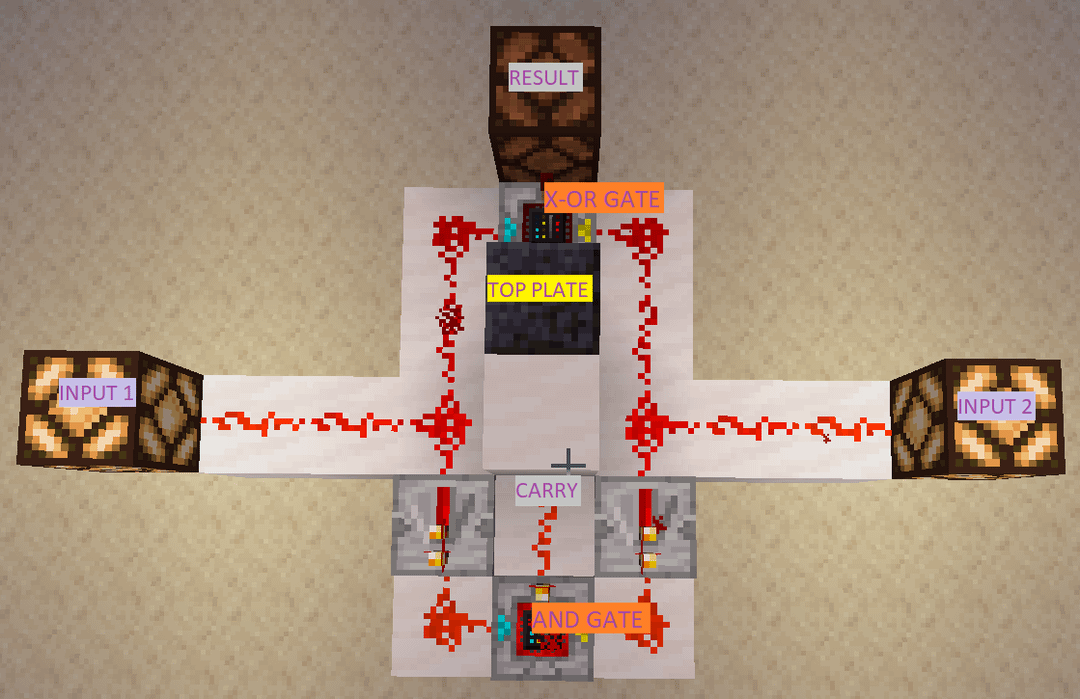 For the carry, I've used the most simple way (yet effective, after all) that's possible, which is to group three AND gates and point them to a single block with redstone dust, so that if at least one of them is activated the carry wire is so.