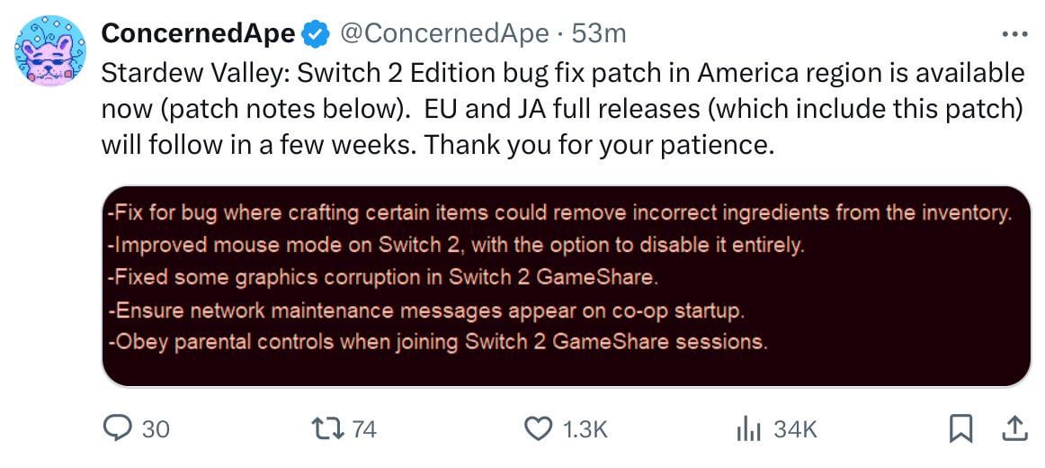 https://x.com/ConcernedApe/status/2024237971843817624?s=20 Only for America though by BobCorndog Stardew Valley