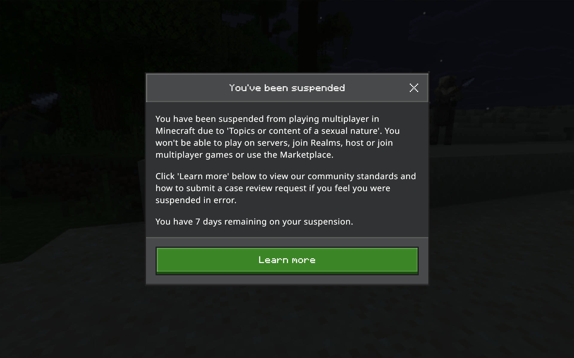 did you do something like that on a single player world? you can get suspended for that even in a private world (for some reason)