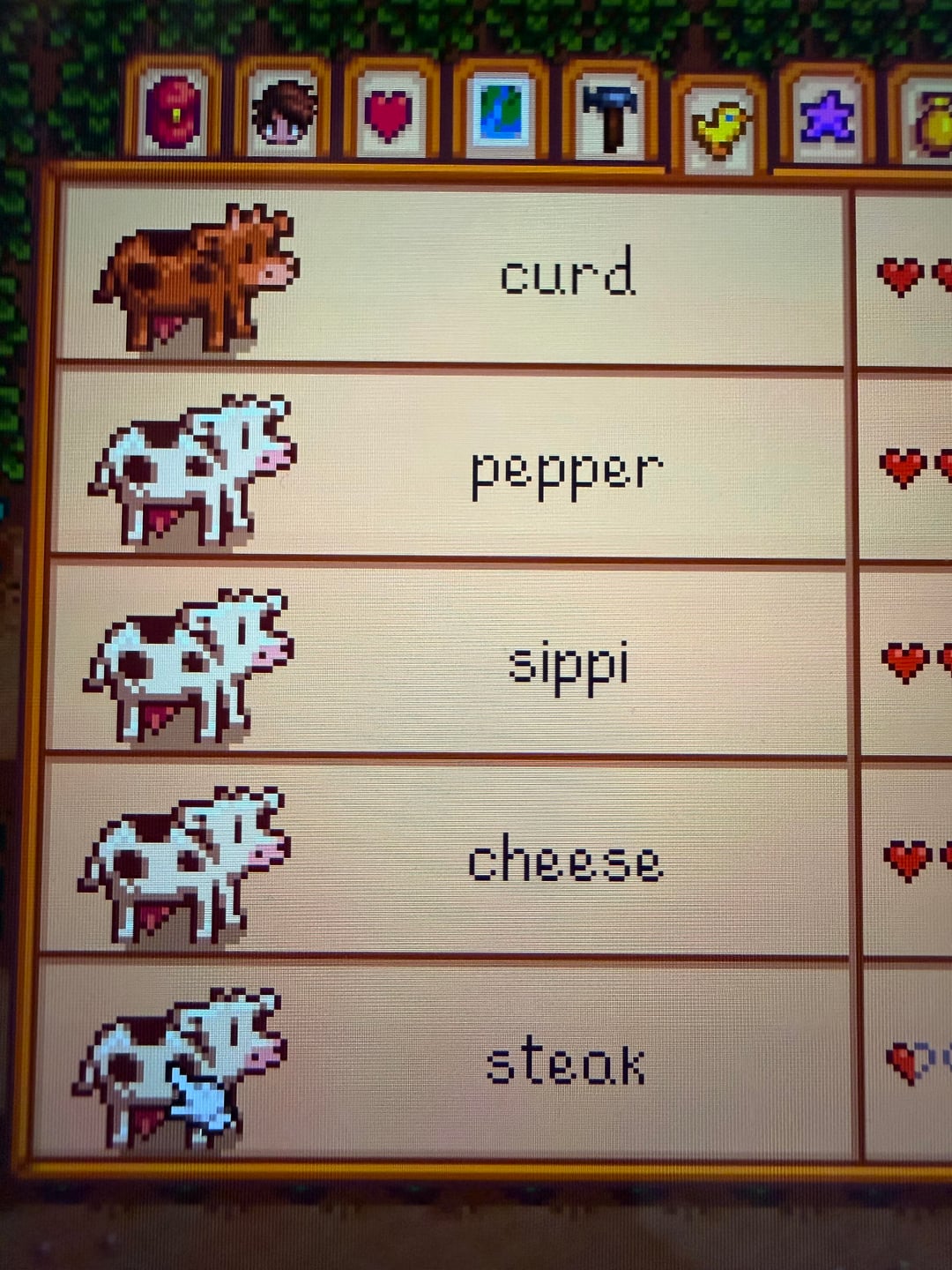 This is the exact same way I name mine, but having the cows called Flank, Sirloin, Ribeye etc