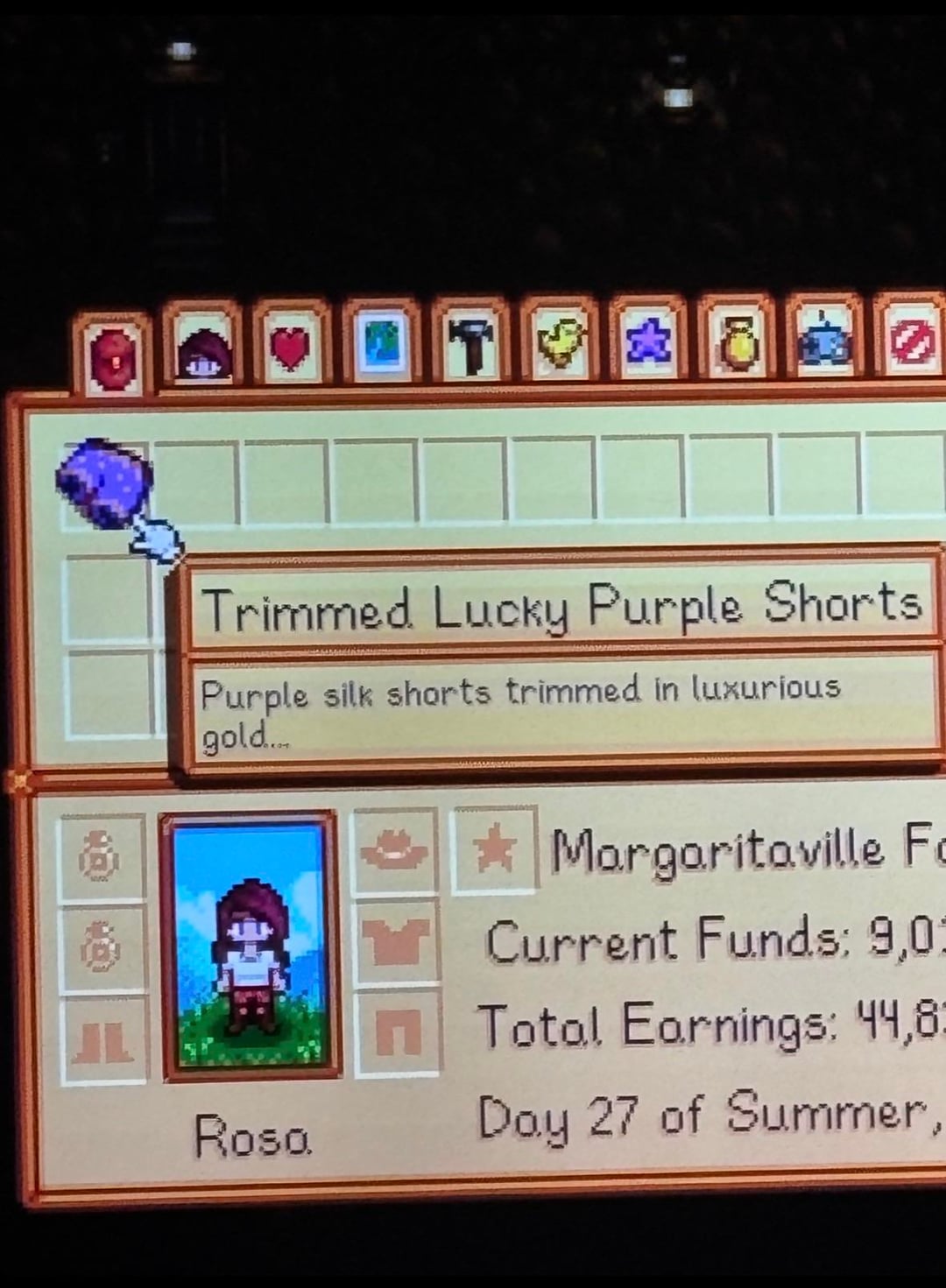 The issue: I got the shorts from Marnie’s room AND the basement, then my husband got the shorts from Marnie AND the basement. This left us with four shorts. We each gifted one to the mayor so now we have two extra shorts.