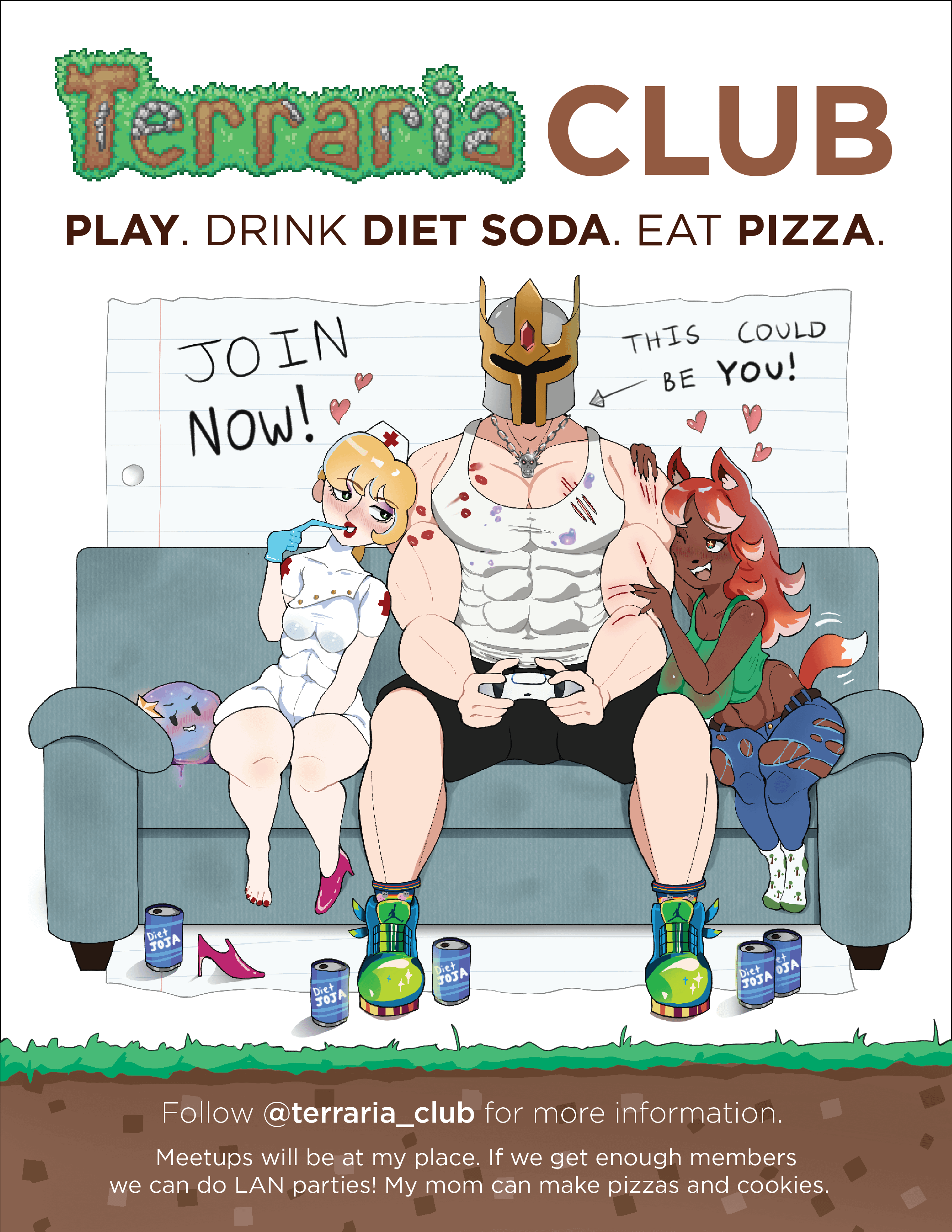 Though my idea of a Terraria club for my college never did materialize, I am still very proud of this poster I made but never used (for obvious reasons). Out of curiosity, would have gotten you to join?