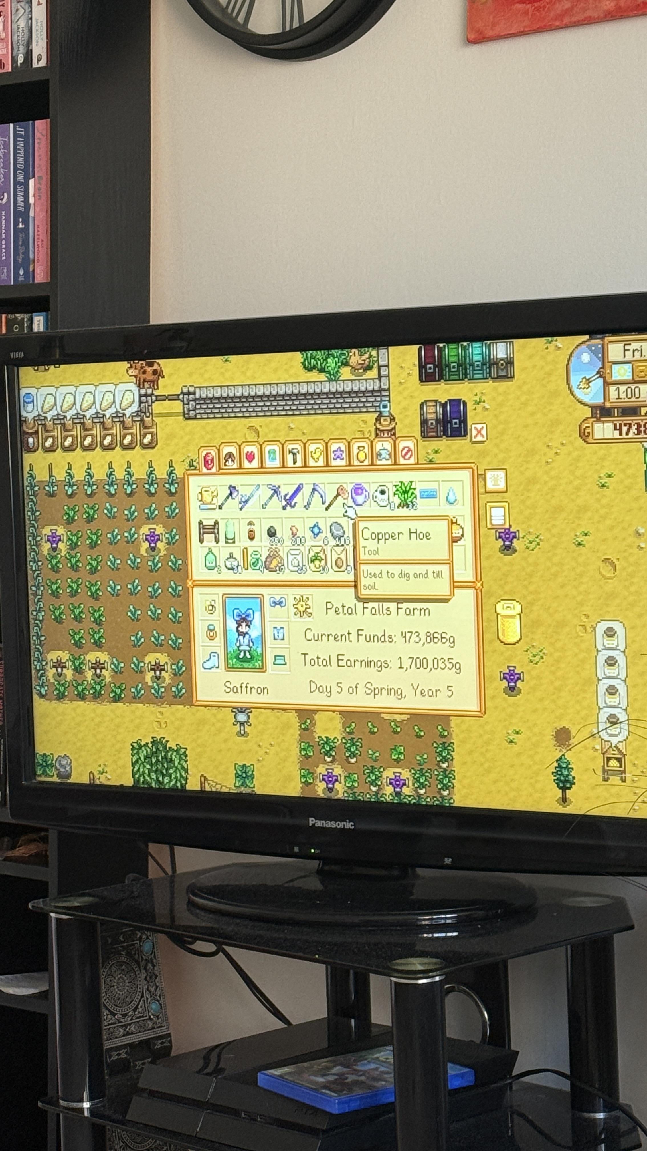So Iβve been using the regular default hoe that you get at the start allllllll this time and not once, while I upgraded all my tools and most to IRIDIUM, did it occur to me to upgrade my hoe π©. I hoed every spot thatβs in the picture individually because as title states, mega moron. Spring came and I wasnβt prepared so I put down what I could before giving it to Clint for 2 days. Now I can do 3 at once and this will change my life. Mind you, I grow a whole load of produce as well and I was upgrading my watering can and sprinklers regularly. Anyways I felt I should do a post of shame because I am ashamed ππ©