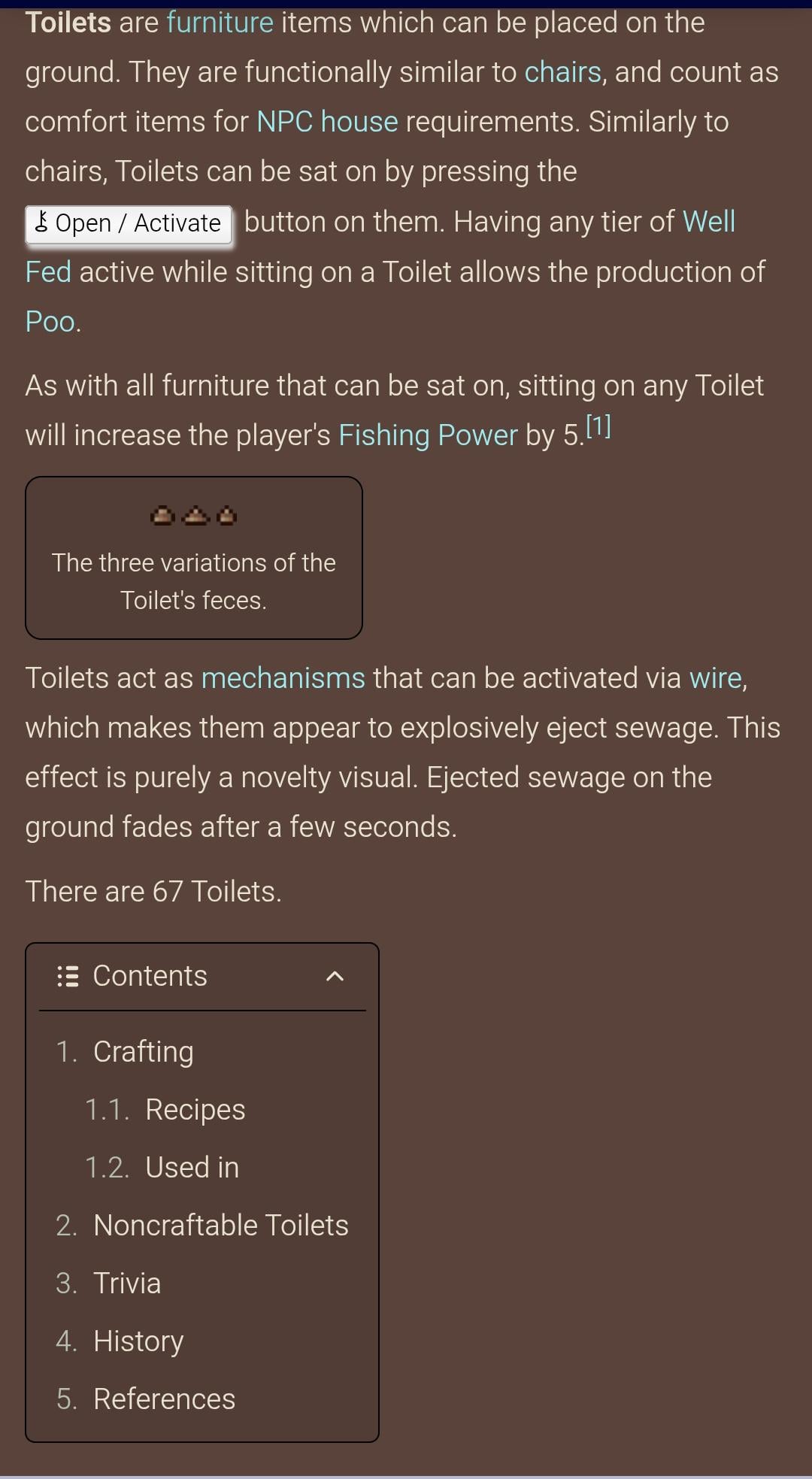 there is actually 67 toiletsas 1.4.5. I counted. idk is this in purpose on it is accident, but live with this now. sorry by Sad_Barracuda8072 Terraria