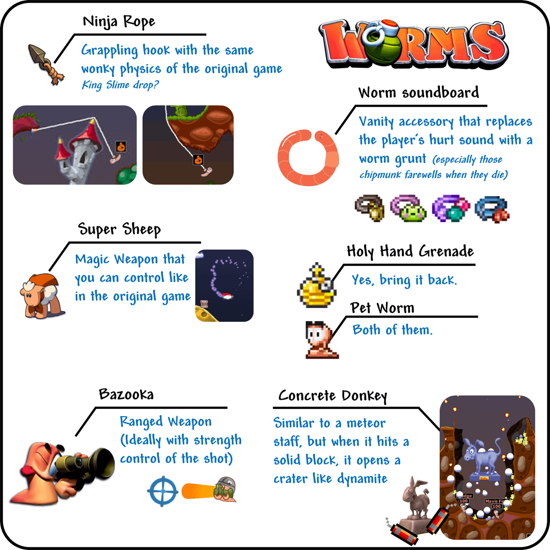 there was a collab of terraria and worms in like 1.2 . worms 3 on mobile still have their vanities from terraria. i wish they didnt remove it