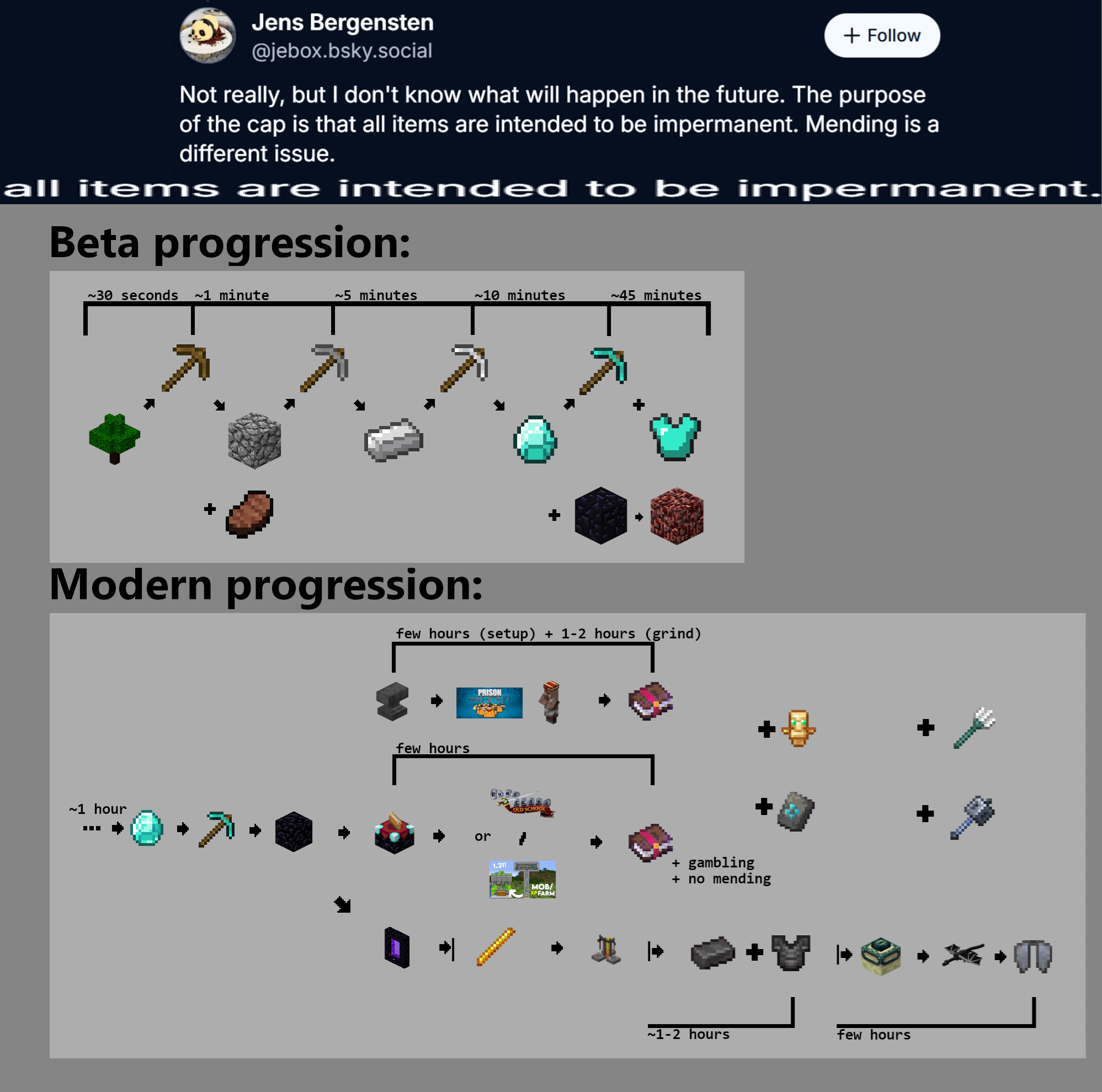 Recently Jeb tweeted on Bluesky, answering a question about anvil level cap. He said "All items are meant to be impermanent".