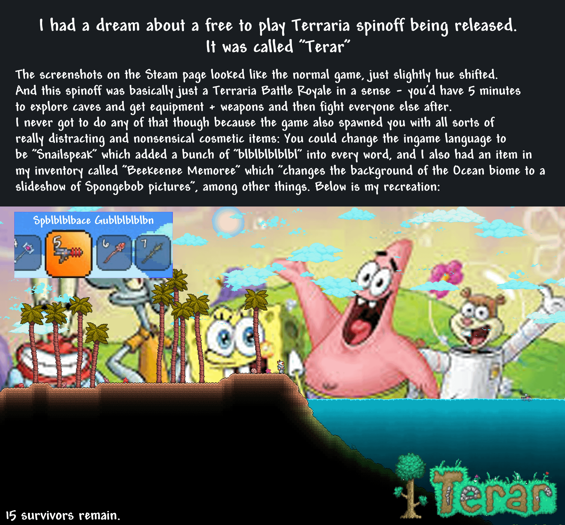 Kind of unrelated, but I remember playing some weird free terraria knockoff like 6 years ago. The only thing I remember about it is the crashed zeppelin.