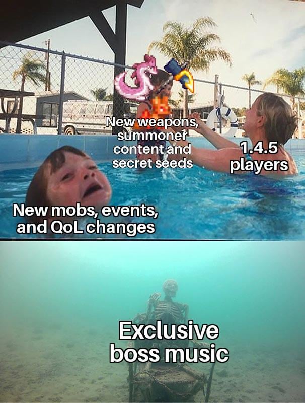 New songs? Twins is so good. After getting used to Skeletron Prime is cool as well, it feels a bit chilly (pun intended). I feel like current Destroyer song isnt too bad but it feels fast for a supposedly sluggish fight. Brain song was better for him. Eater of worlds sounds good, fits a bit slow but chaotic fight. I dont really remember other new songs sadly.