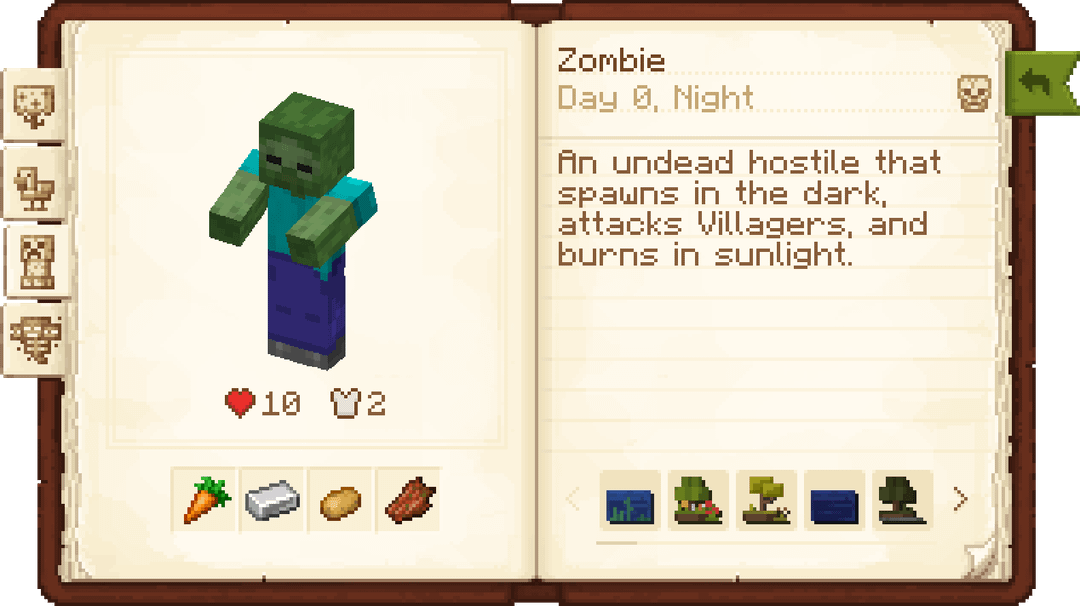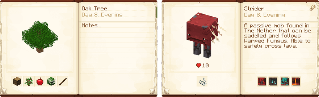 It works seamlessly with any mods, and displays loot, biomes, and lets you write your own notes on each entry directly in-game. The mod's extremely customizable and fully data driven as well, allowing modpack creators to retexture every part of the mod and add their own categories/entries as they please!