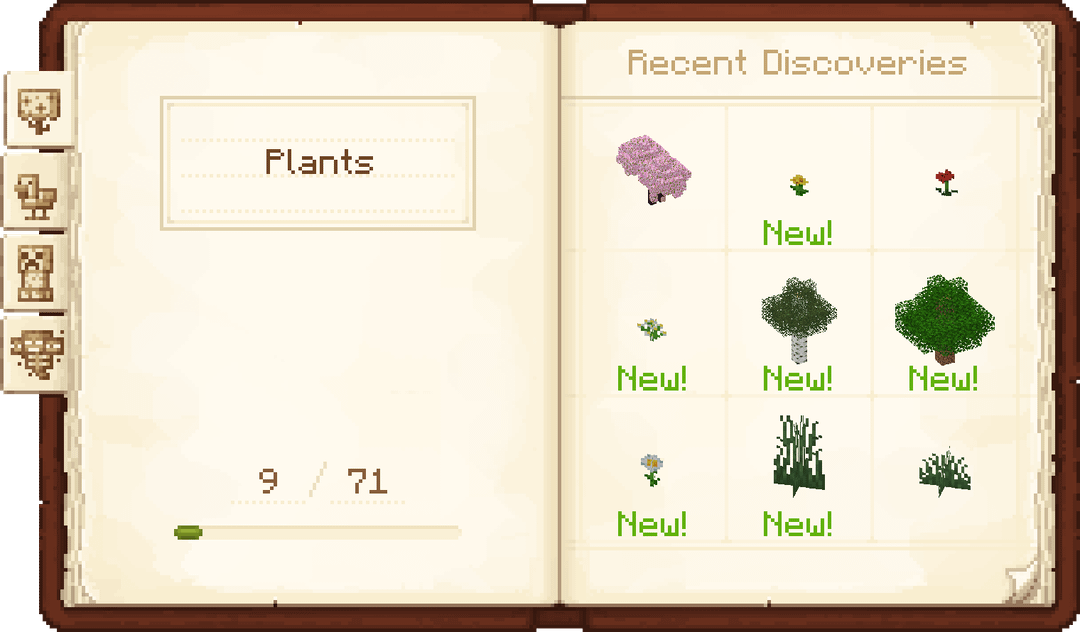 Field Guide is a mod about discovery through exploration! Find cool plants and animals, and scan them with your spyglass to add them to your own personal Field Guide!