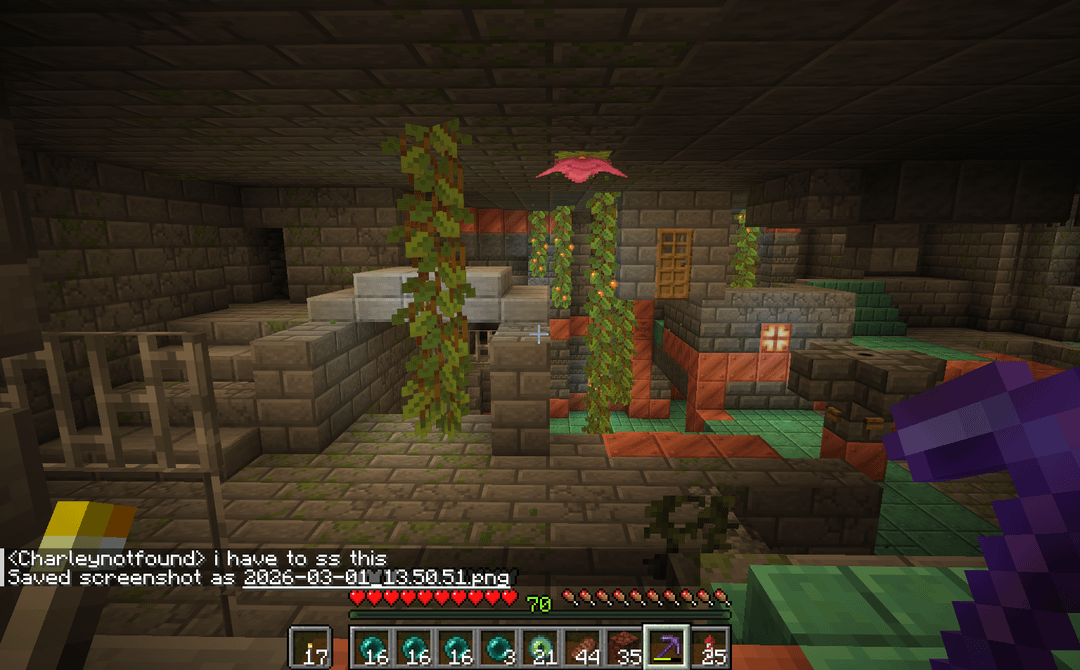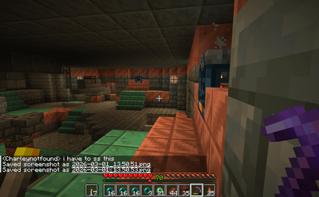 found this on my server that I have with my friends. ​a stronghold with a trail chamber, lush cave and mineshaft in it. this is Minecraft Java edition!