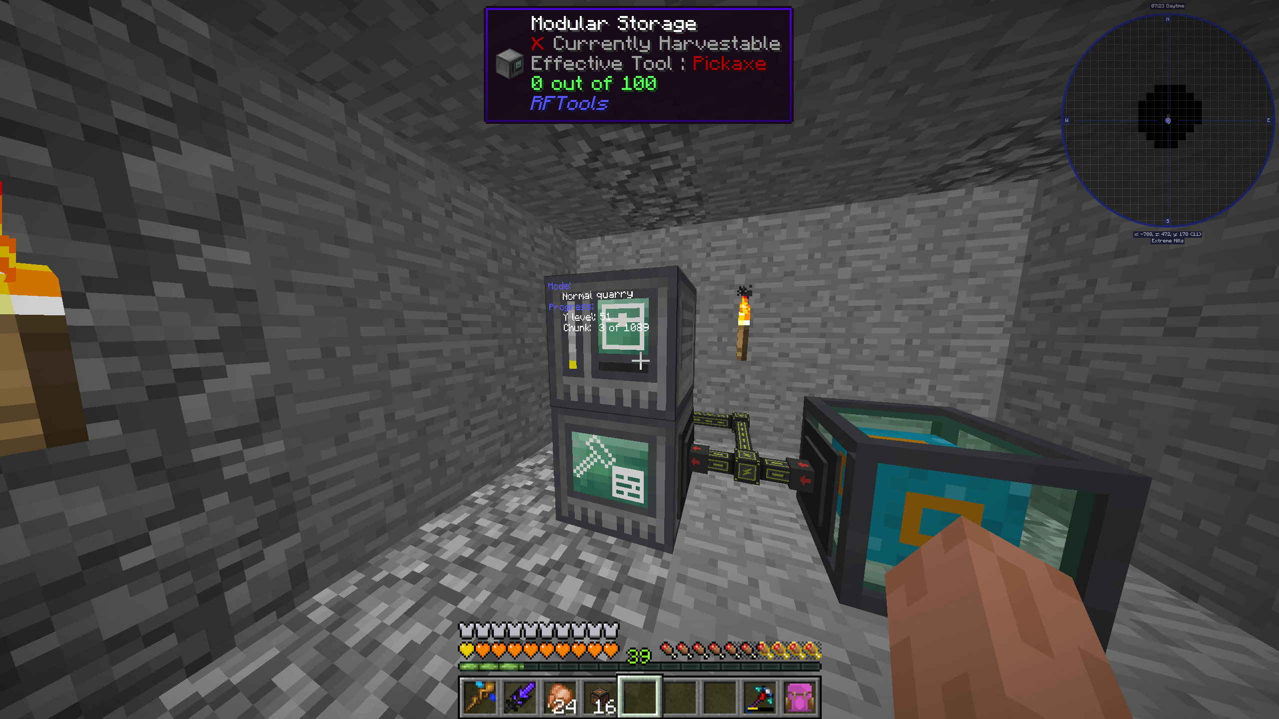 With this setup, while standing in the deep dark the items from the builder will transfer into the main storage system correctly, but if in the overworld, items stop appearing in the modular storage in the overworld and get clogged in the modular storage in the deep dark.