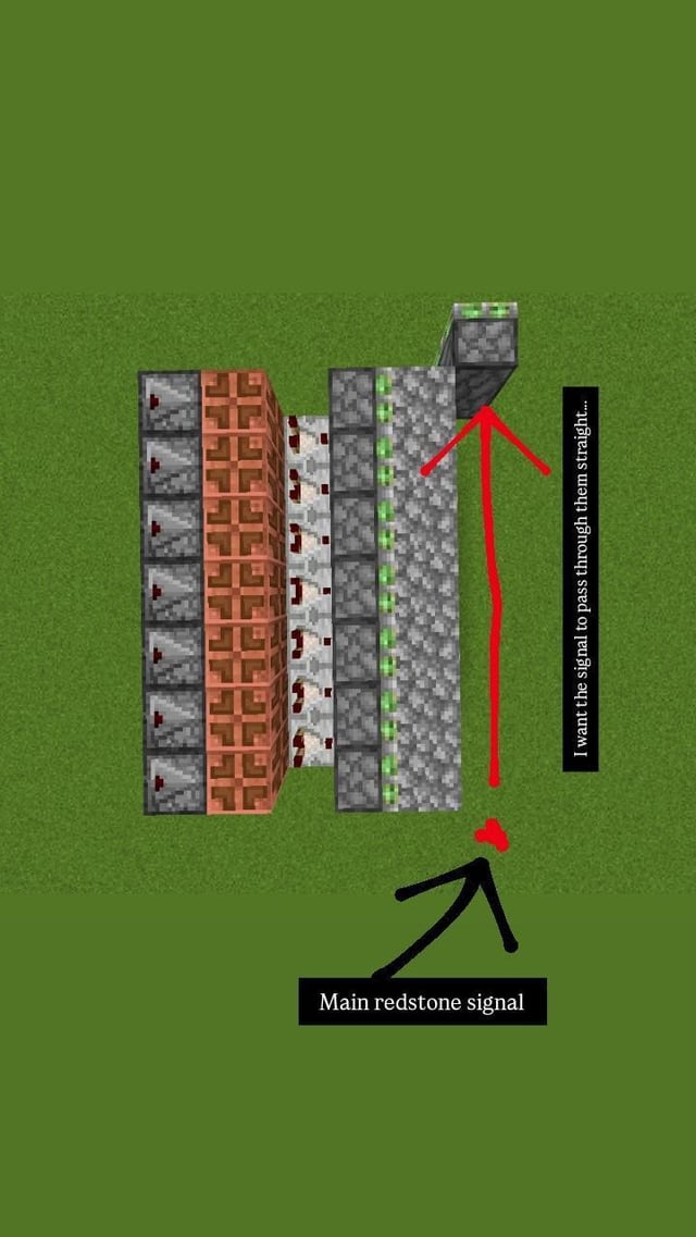 I'm making a sugarcane farm where the canes only get farmed when all the canes are fully grown but i ran into a problem where I can't figure out how to send redstone signal through multiple blocks ( shown in the 1st image ) can anybody help me with it…and i can't change any other stuff cause i have planed something after this problem is fixed , so i would appreciate if you guys can figure out a way to only fix my problem without doing any change to the rest of the machine.