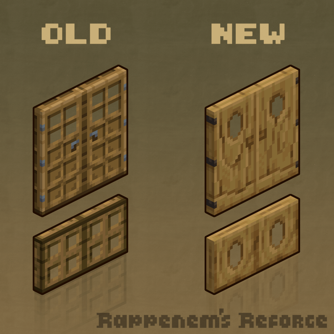 1. Tried to make them look more natural, like if they were carved out of wood but without looking too modern. Also made the trapdoor color actually match the door, something which Mojang couldn’t do apparently.