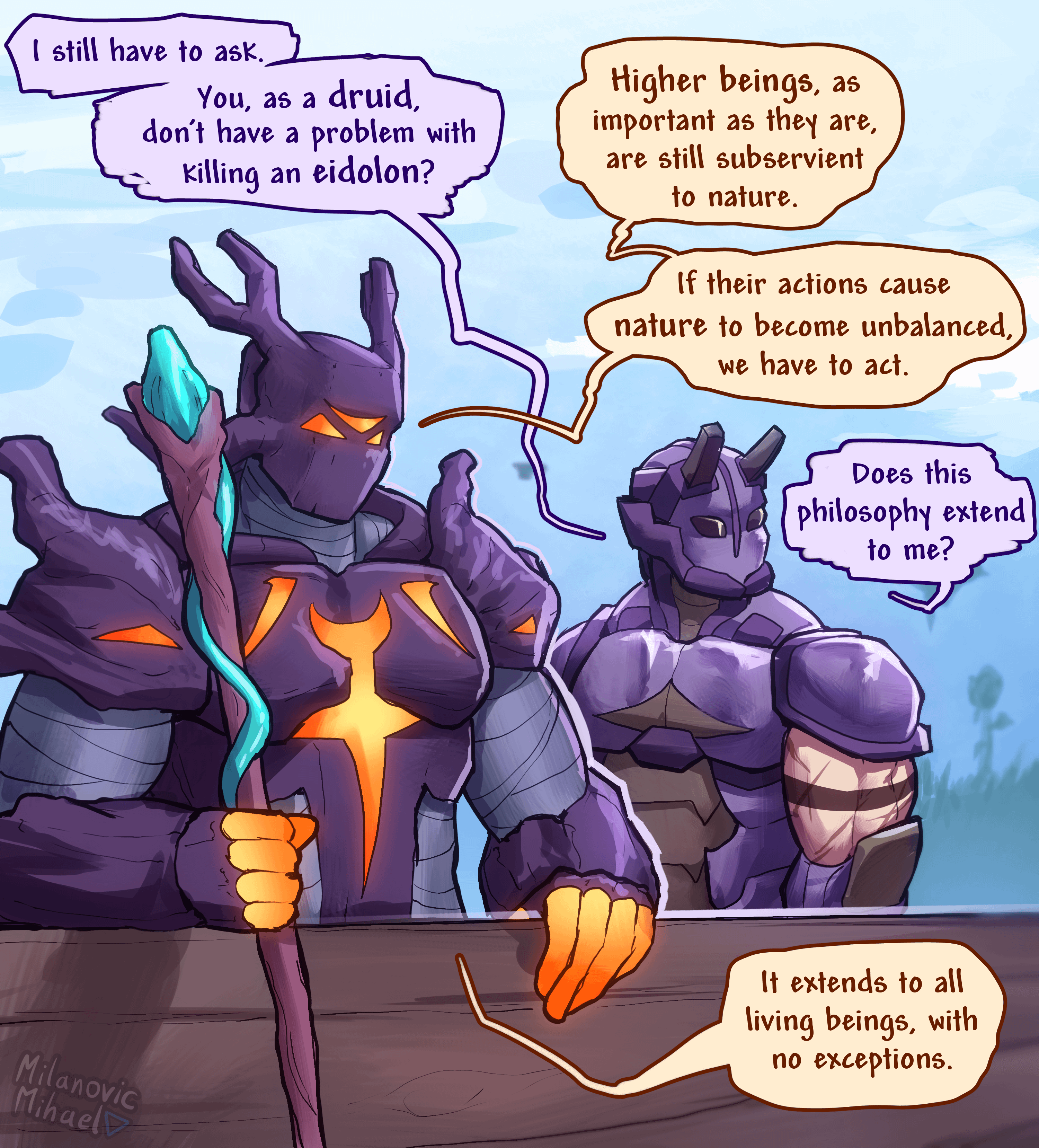 I love how the Terrarian is basically asking the druid about the morality of farming bosses lol. The comic style is really nice too