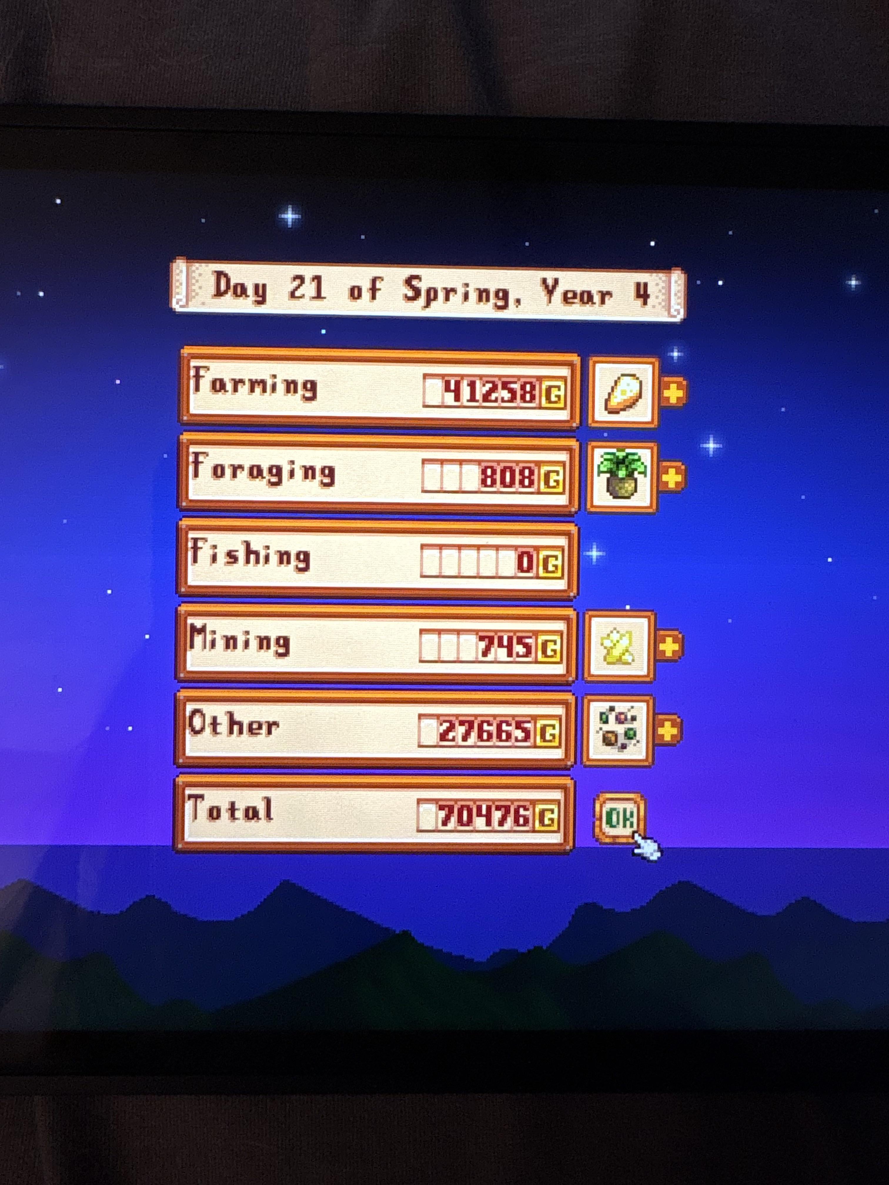 My very first little farm, and today I had my first truly big harvest day — 70,426g. I feel like a proud little homesteader watching the fruits of four in-game years finally bloom.