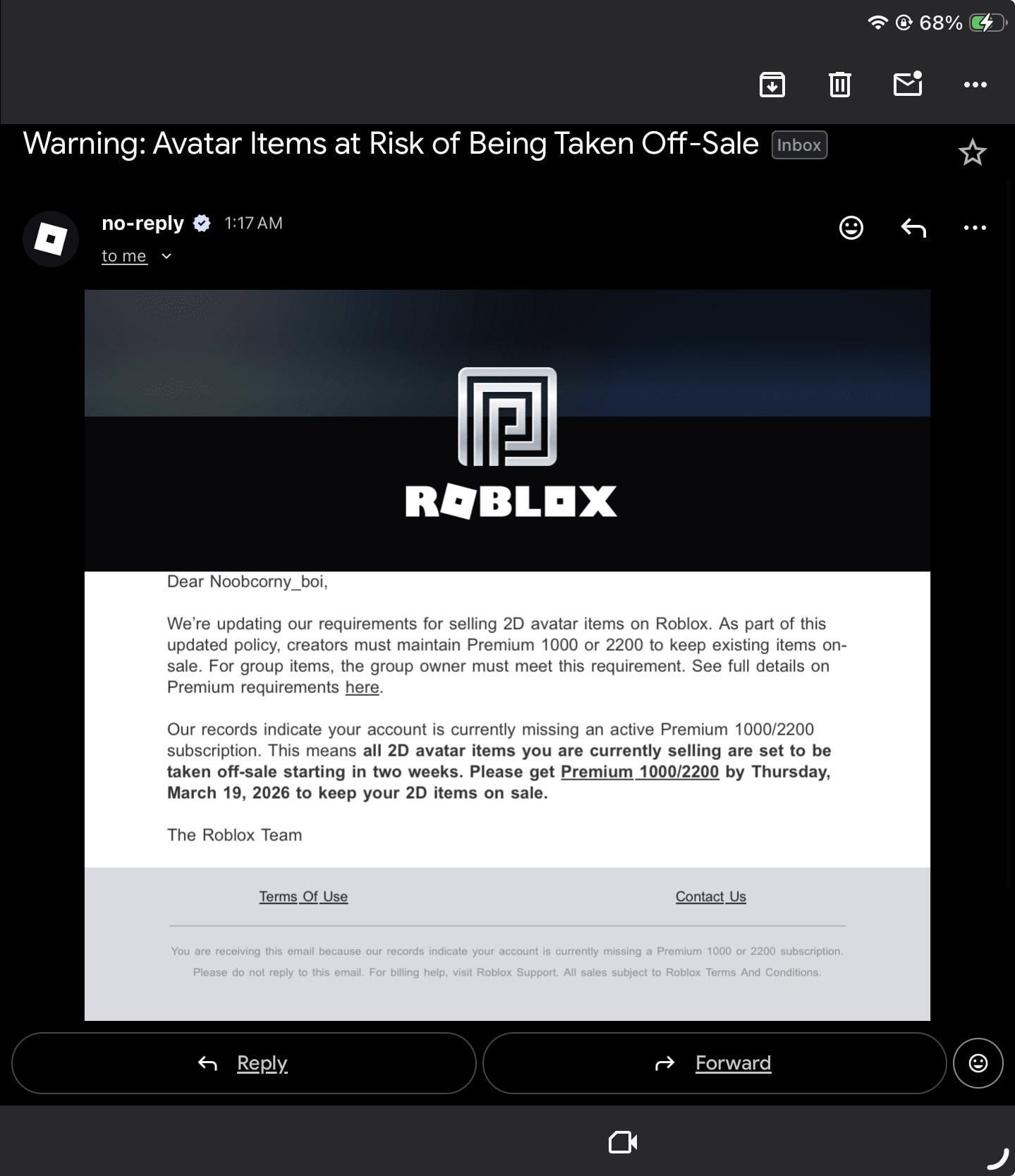 also got the email, don’t really think its greed other than them just wanting 2D clothing access gone for the main public in favor of layered clothing, otherwise why’d they only make 2D clothing need a sub to put on-sale (and let people buy and use it for a cheap 5 robux (now that i think into it further it kind of is greed since layered clothing has a higher minimum floor price) and not ugc or layered clothing?
