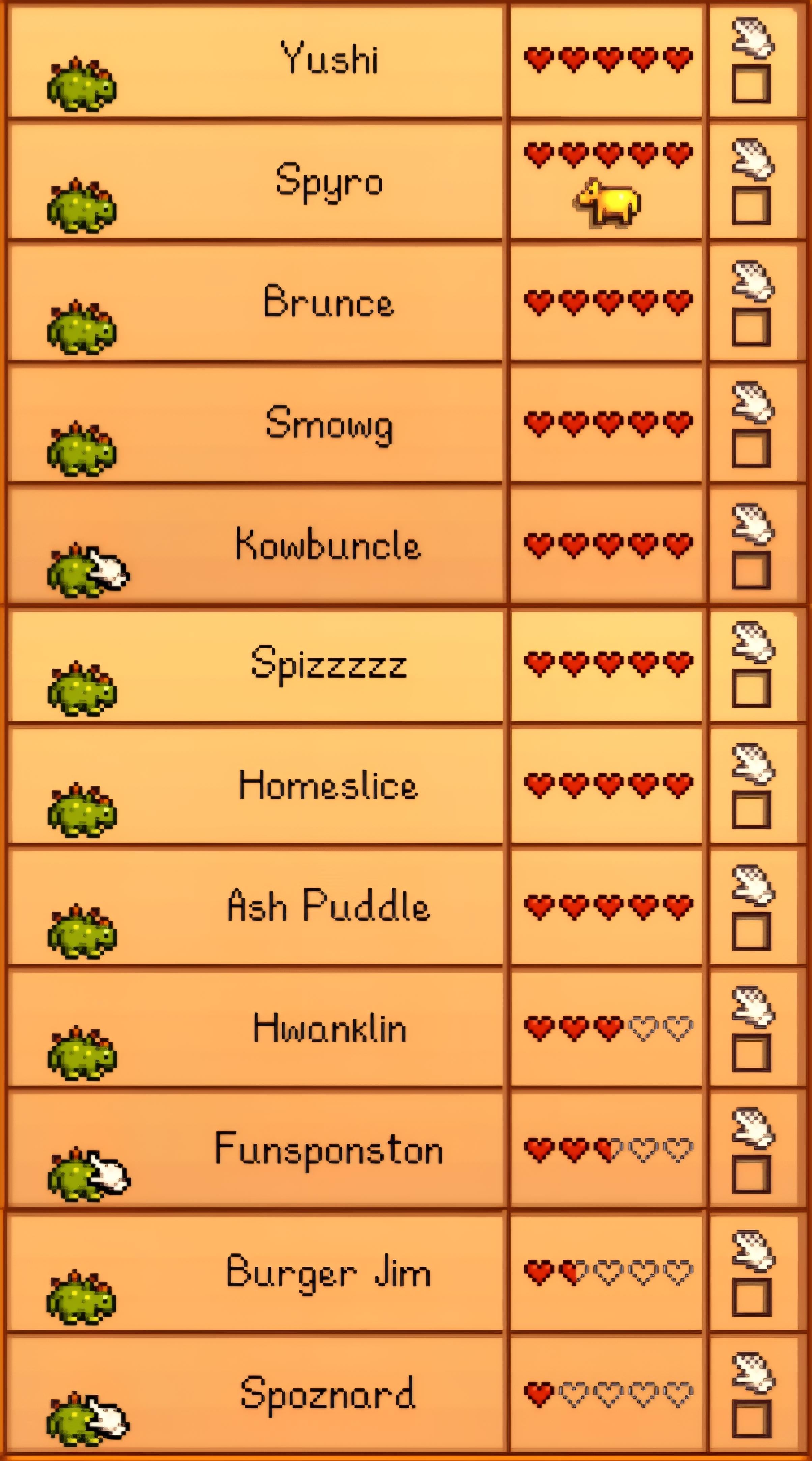Here’s a list of some of my animals in my current save: