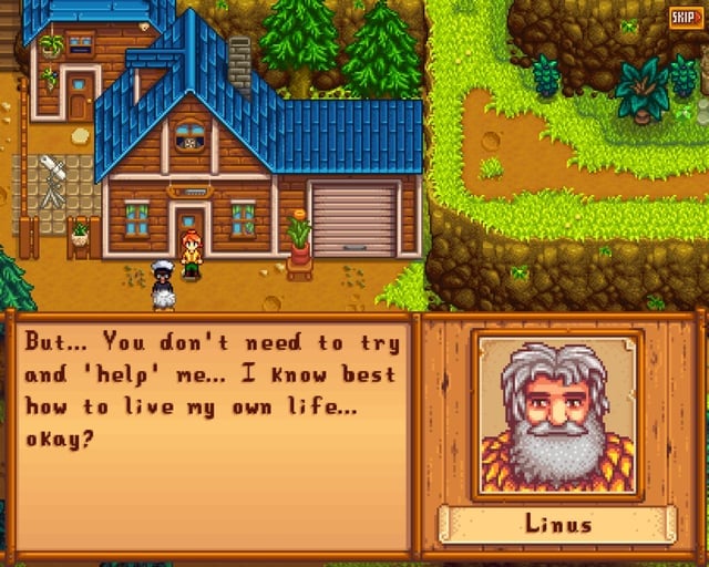 My dream situation for Linus is kinda like how we roommate Krobus, but instead we simply let him set up his tent in the spouse area. He never goes inside your house because he doesn’t want too but allowing him to move allows us to ease the troubles his lifestyle faces (the rock throwing and spray paint incidents). And the 13 heart event is a really stormy night where it’s extremely unsafe for Linus to be outside so we get the Wizard to cast a spell on his tent which adds a layer of magic (a visual pattern appears on the tent from this event onwards) to protect him showing we truly care for him and respect his decisions but can’t just stand their and watch him die.
