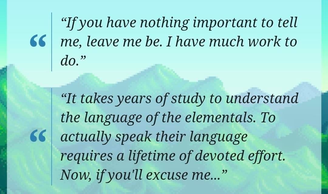 You made me think, what if instead of being roommates/marrying the wizard he moves to the farm to learn more about the junimos and we become his apprentice! Of course it’s mostly just flavor text same as the others but still a cool idea