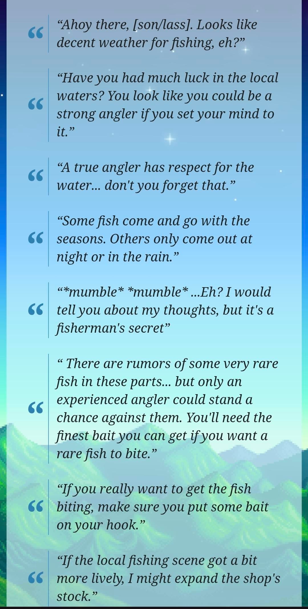 I wanted Willy cause I love the fishing mini game, and reading this; I think it would be kinda cool if you could develop a relationship with him as your fishing level rises. And once your level is maxed you can date or marry him over a mutual love of fishing (I know thats a bit much for stardew)