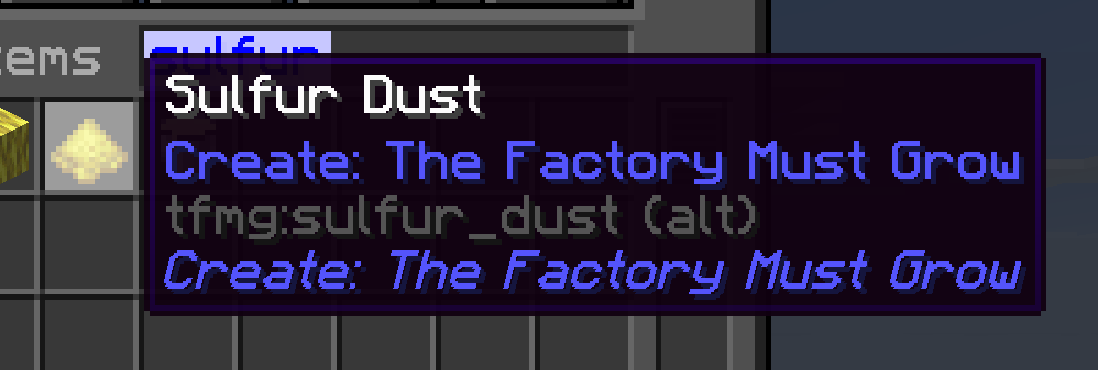 I am trying to replace all instances of Spelunkery's sulfur with The Factory Must Grow's but I am getting an error where Minecraft is complaining it cannot find TFMG's sulfur dust block ID. In trying to debug, I see that the block ID has "(alt)" beside it but I am unsure what this means. Here is a photo of what I see. Can someone explain what this means? Thanks