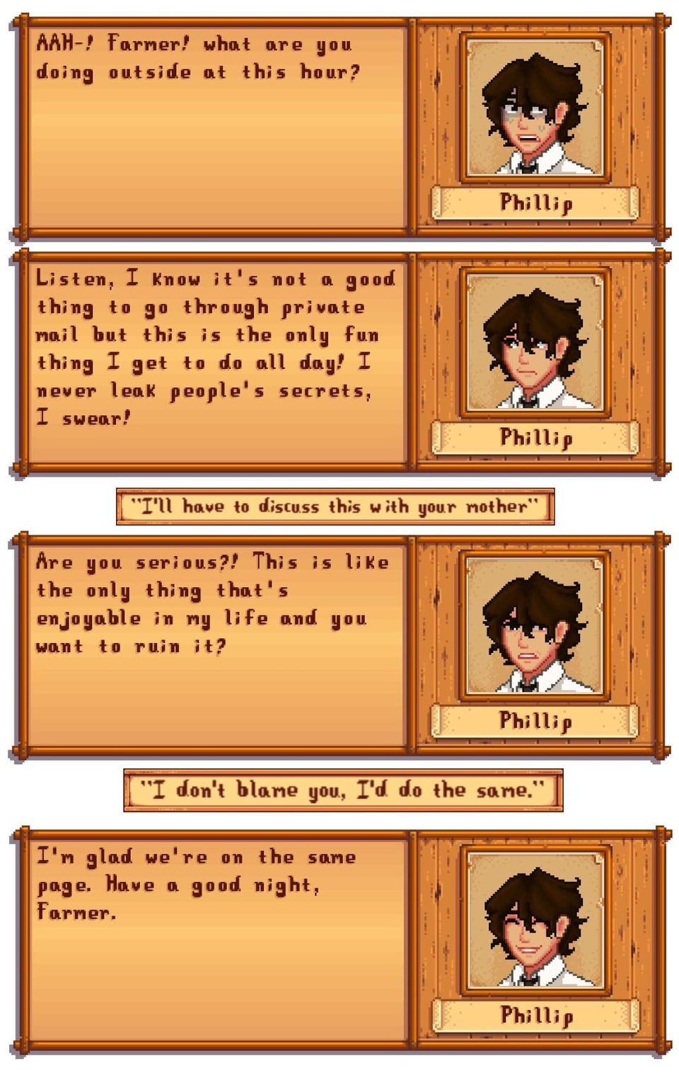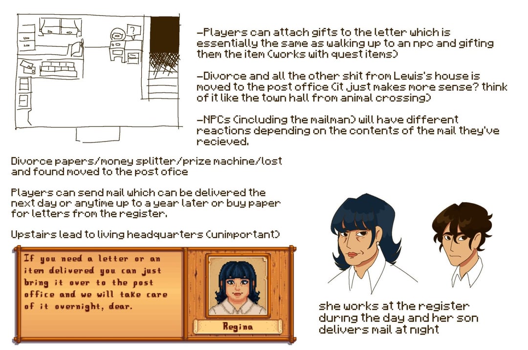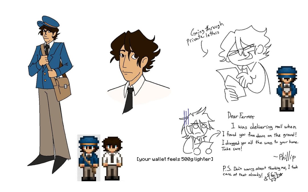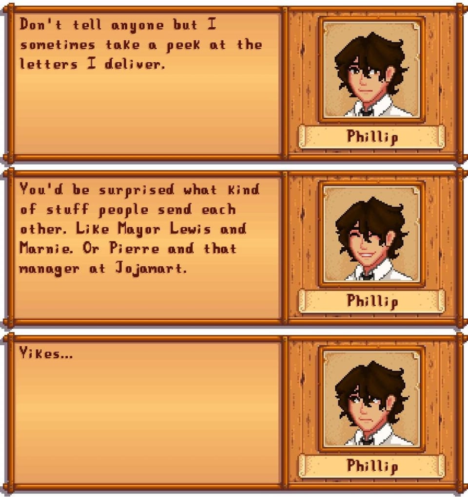 The idea is to have a post office in town like in animal crossing because it’s a nightmare trying to deliver quest items when Clint locks himself in at 4 fucking pm. I don’t know wether Phillip should come clean about his “hobby” or get caught red handed by the farmer.
