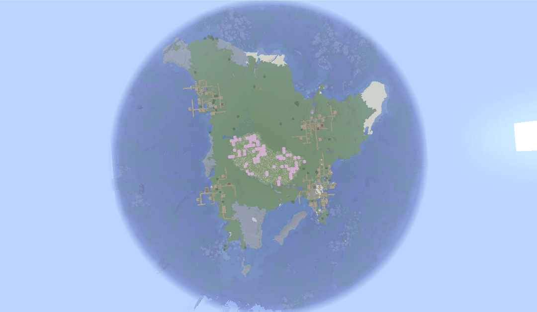 You spawn on a large plains island with 4 villages, and a cherry grove mountain in the center. There's plenty of flat land for building and a ruined portal which has collided with a village house for access to the nether.