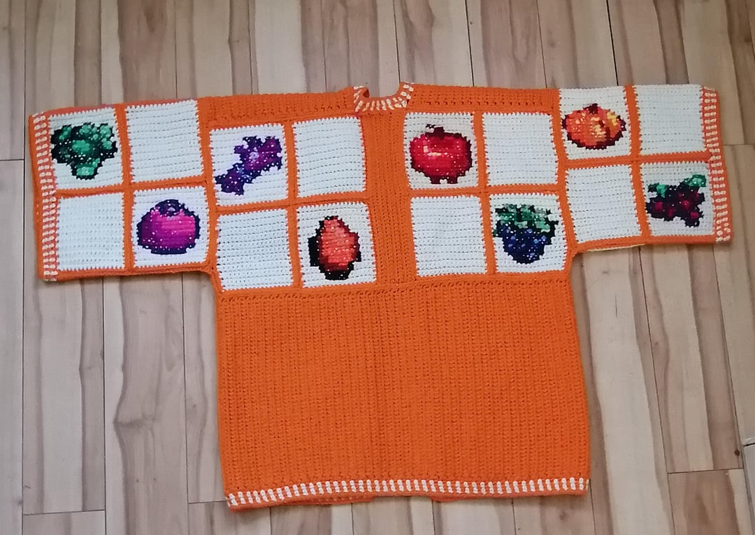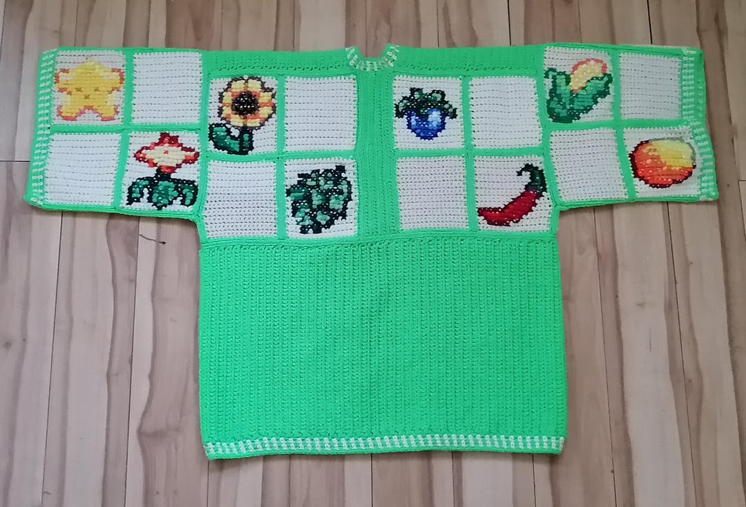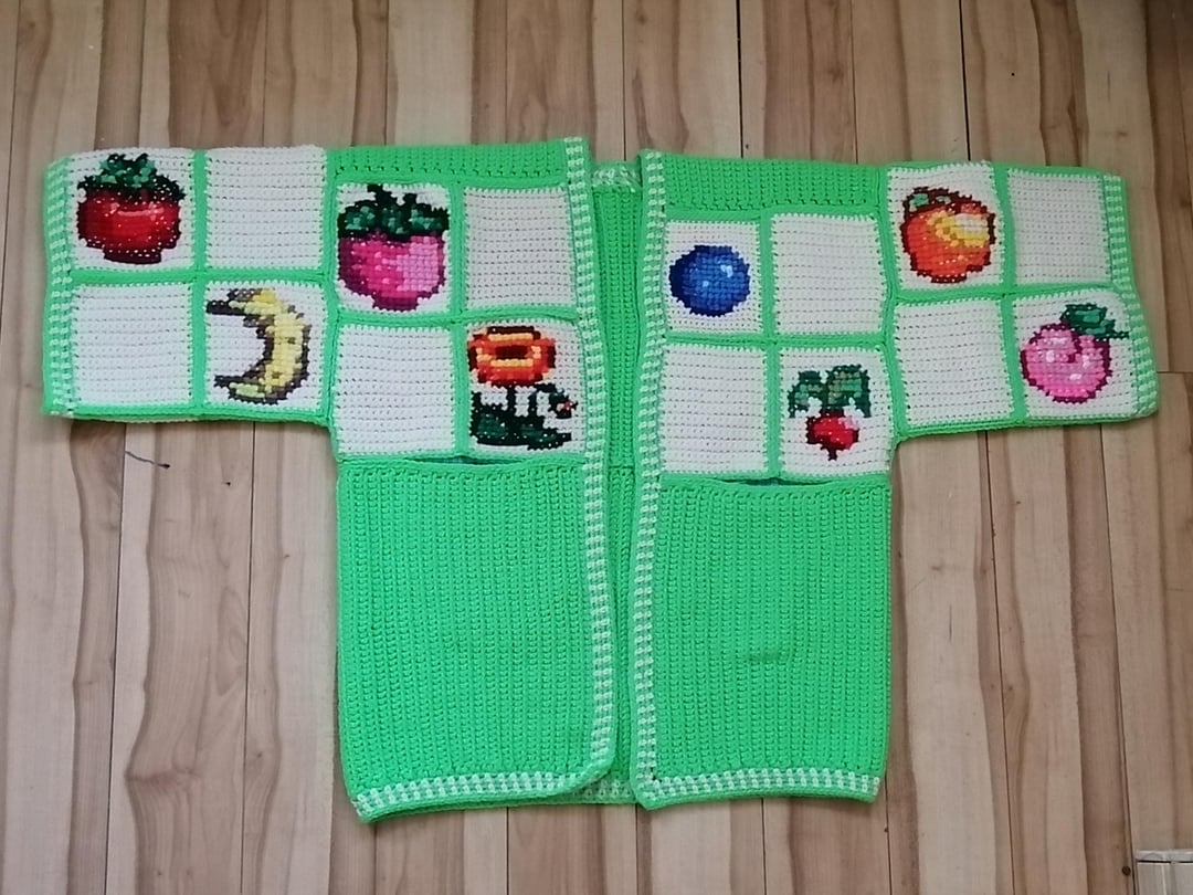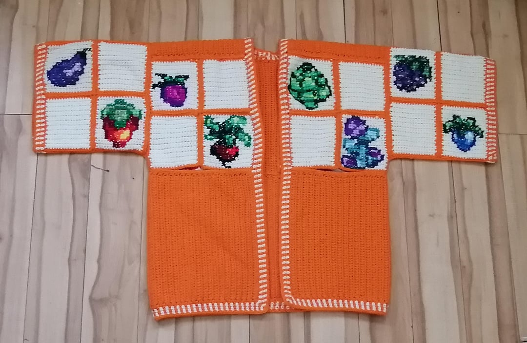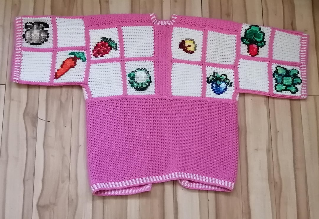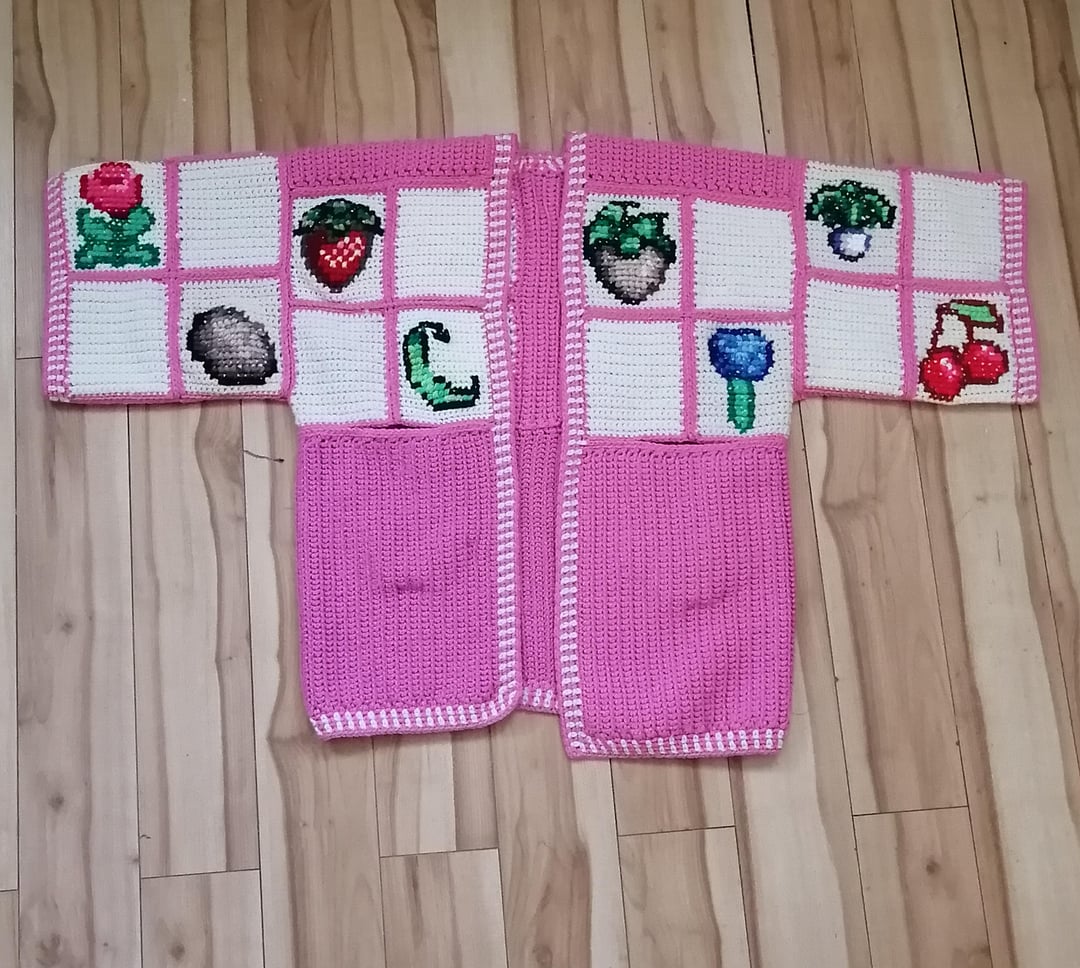 I started work on all three cardigans in December & was able to get them fully completed on March 5th! The sweaters are entirely crocheted with the exception of the crops designs which are done in cross stitch.