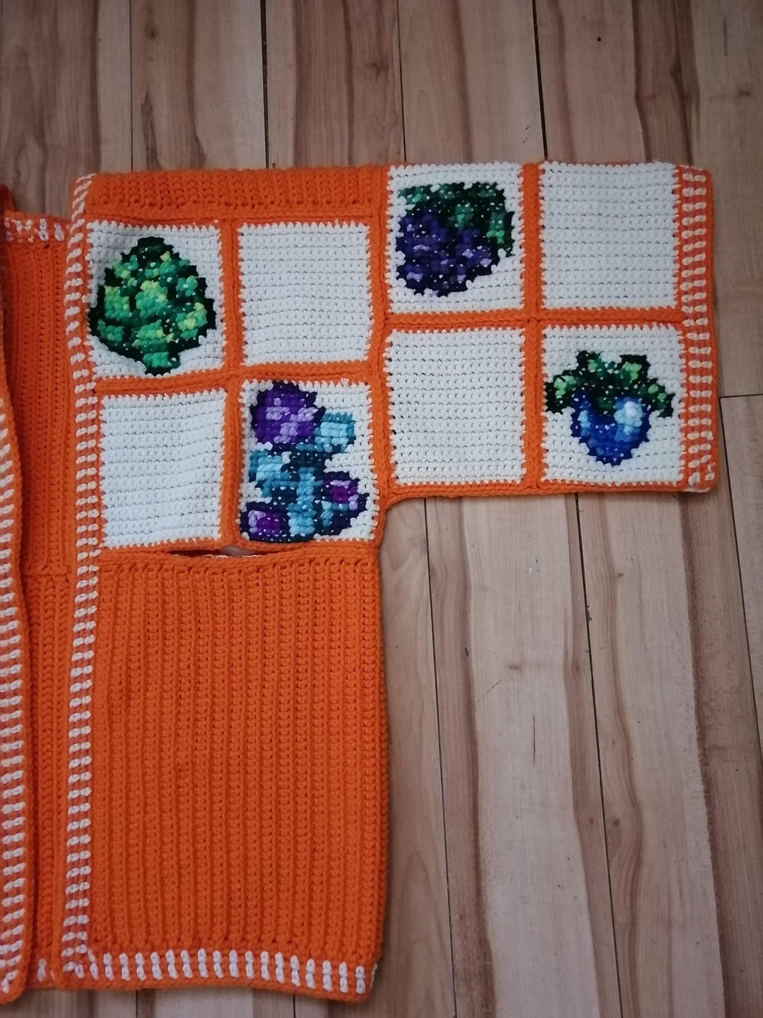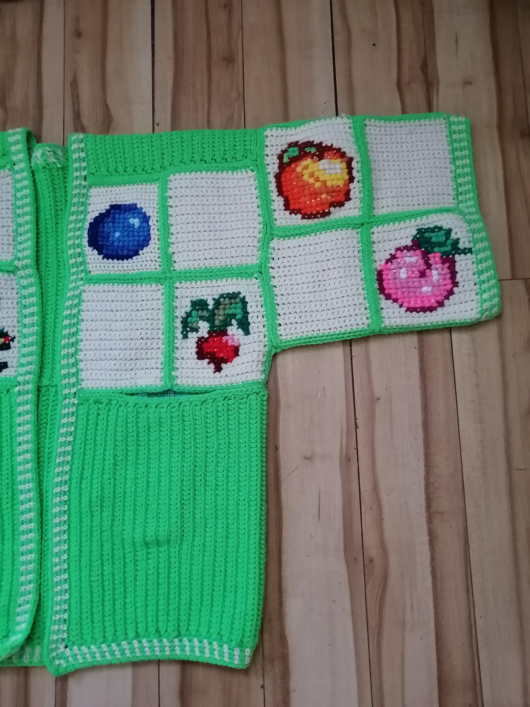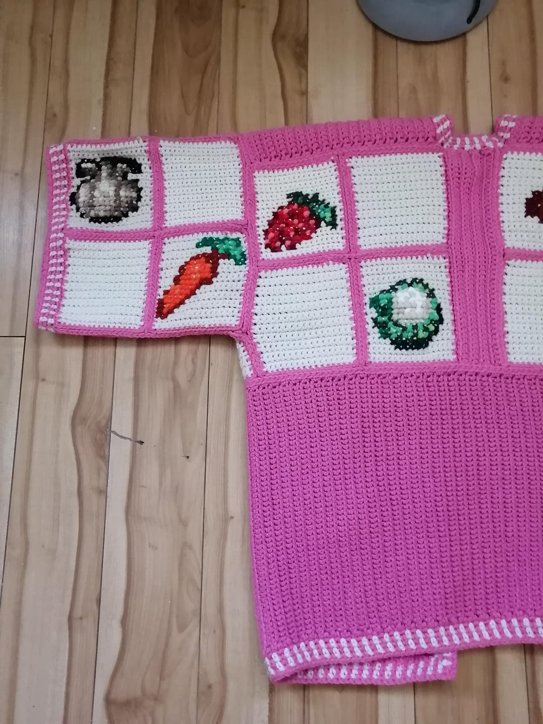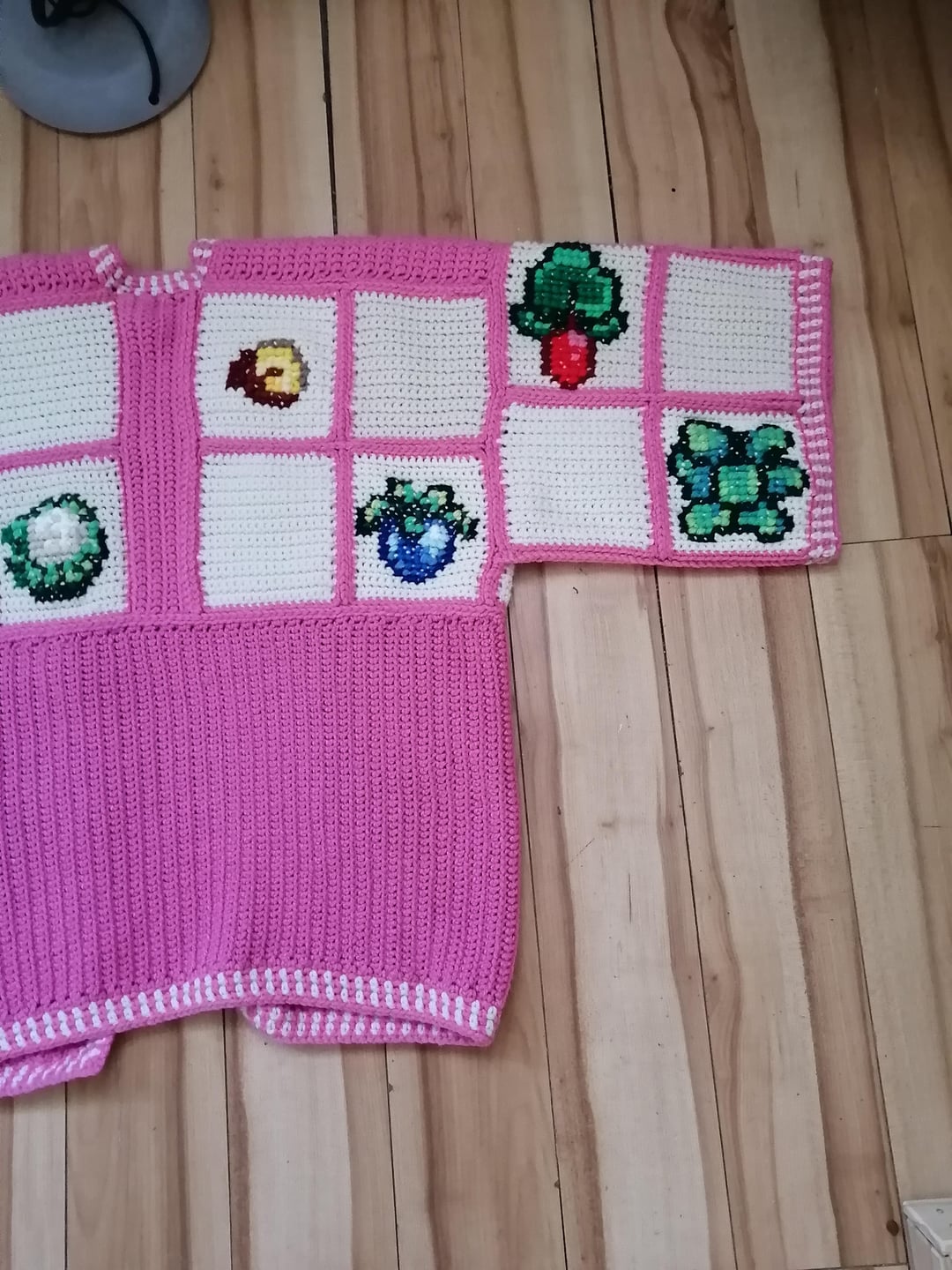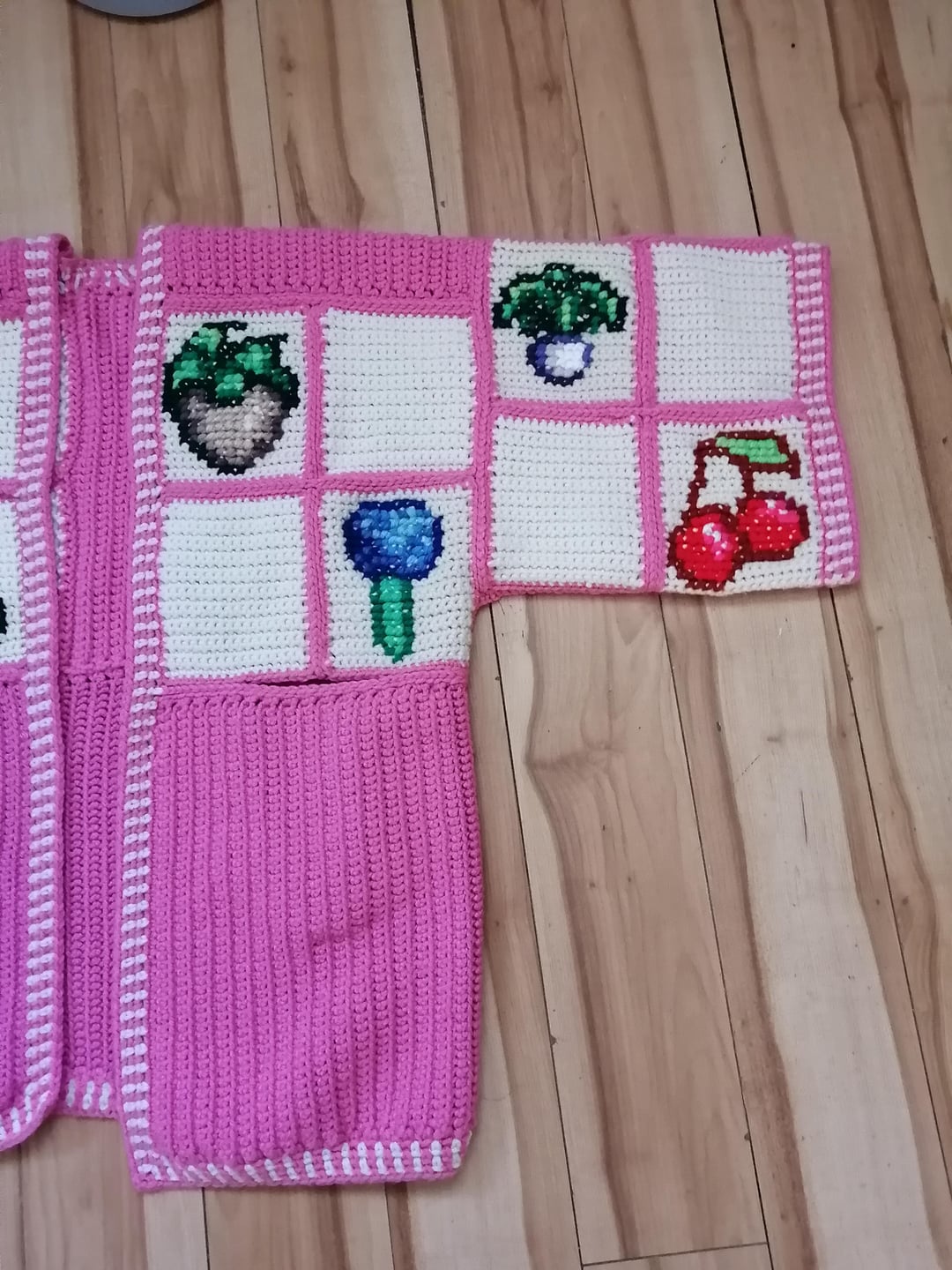 I started work on all three cardigans in December & was able to get them fully completed on March 5th! The sweaters are entirely crocheted with the exception of the crops designs which are done in cross stitch.