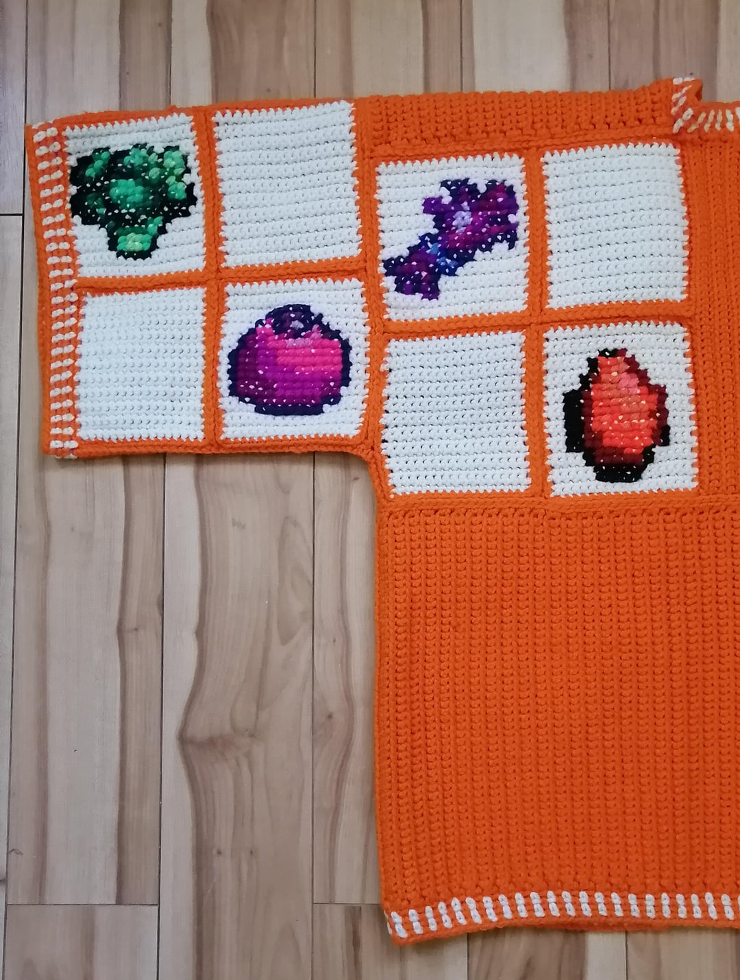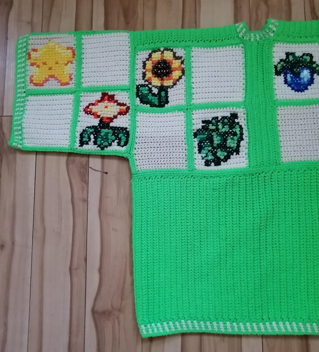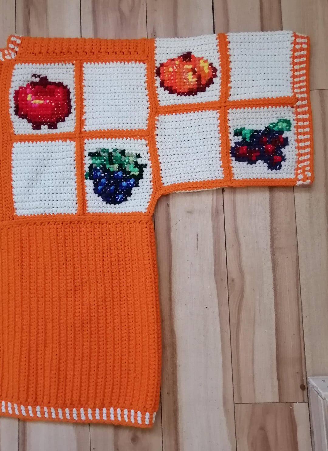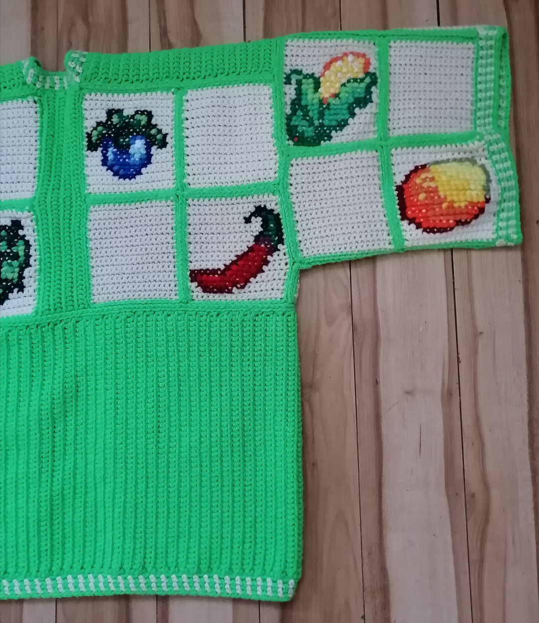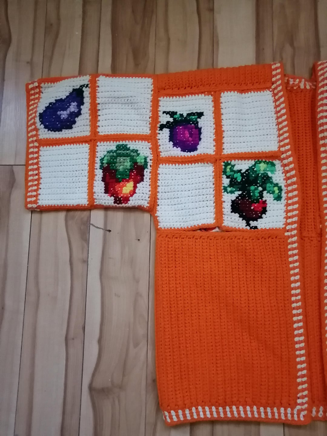 I started work on all three cardigans in December & was able to get them fully completed on March 5th! The sweaters are entirely crocheted with the exception of the crops designs which are done in cross stitch.