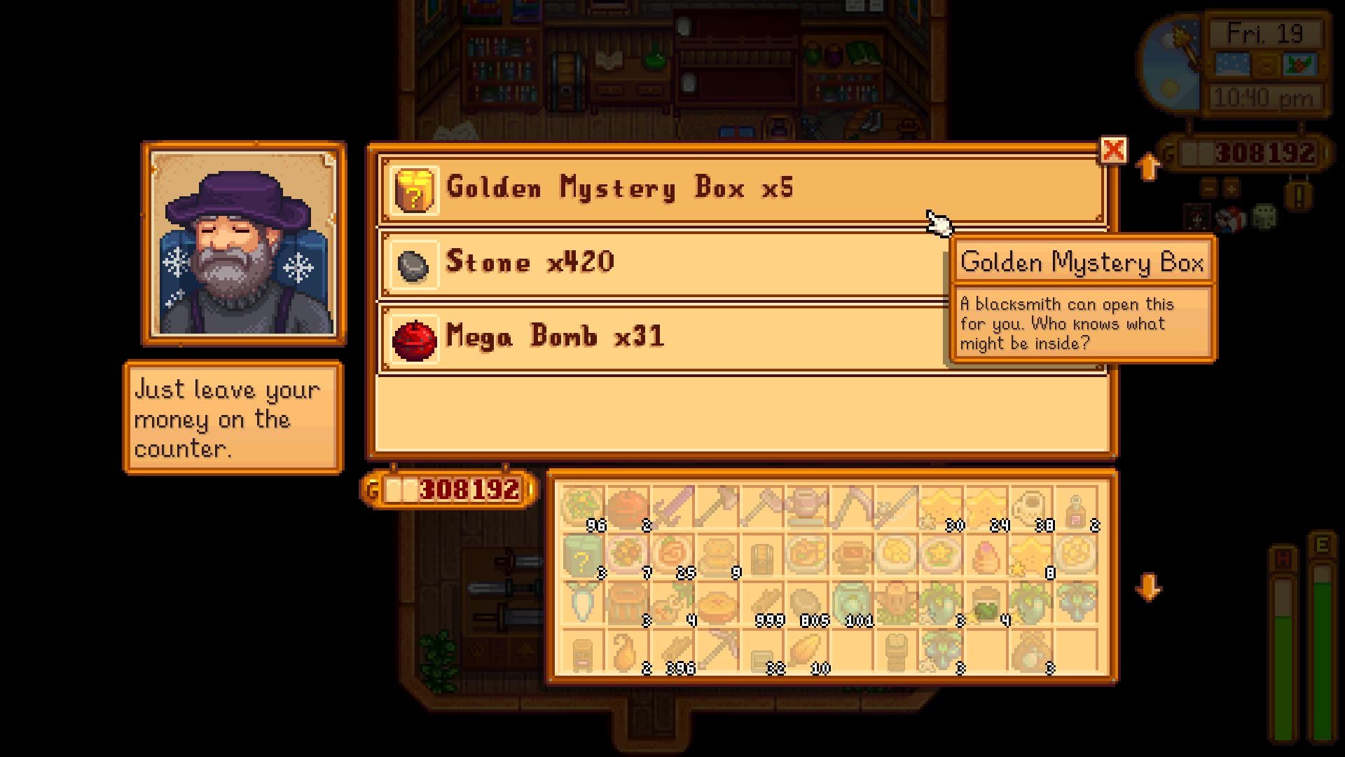 In my most recent play-through, I made a habit of never having my full stack of $THINGS with me. I’d top-up to 75 mega bombs / 15 goat cheese to keep in my inventory, while my main “store” for such was a “mining chest” in my house. This is a habit I’ll probably keep in future play-throughs so such valuable assets aren’t at risk.