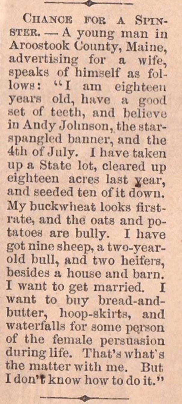 Today we think about romantic love, and base our dating and marriage decisions on that. In 1865 it was honestly a business transaction. Like is freaking hard, and this guy has his stuff together. He won’t beat me, and we can be a productive unit.