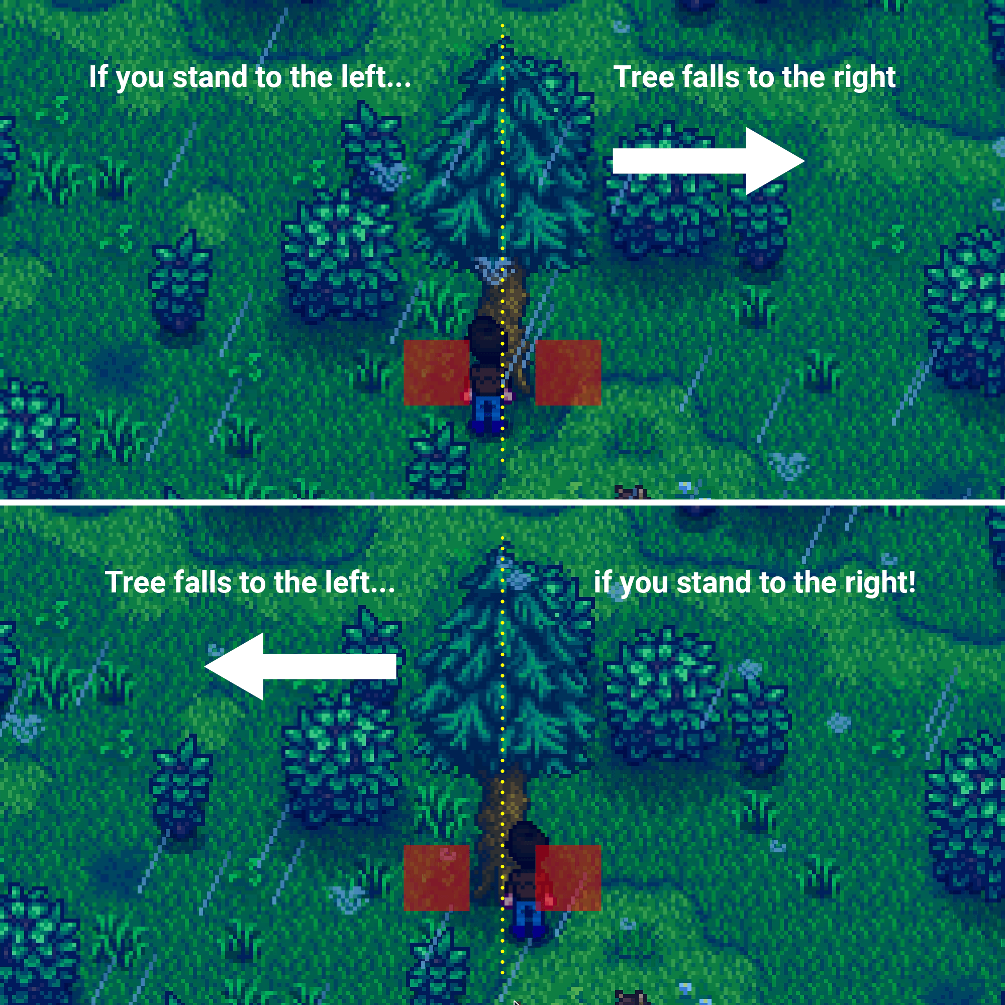 If you chop the tree coming from the top it goes left and if you come at it from the bottom of the screen it goes right!