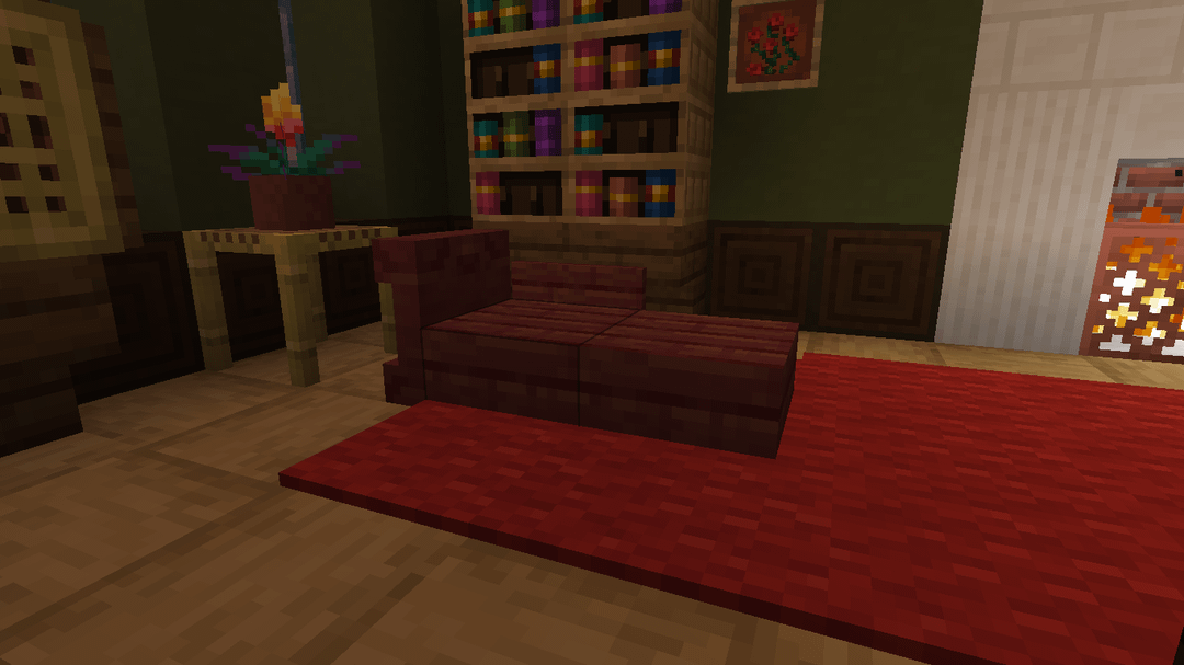 Luxury furniture: chaise longue in mangrove wood; sitting room arrangement around netherrack burning fireplace. by felixrex3 DetailCraft Minecraft