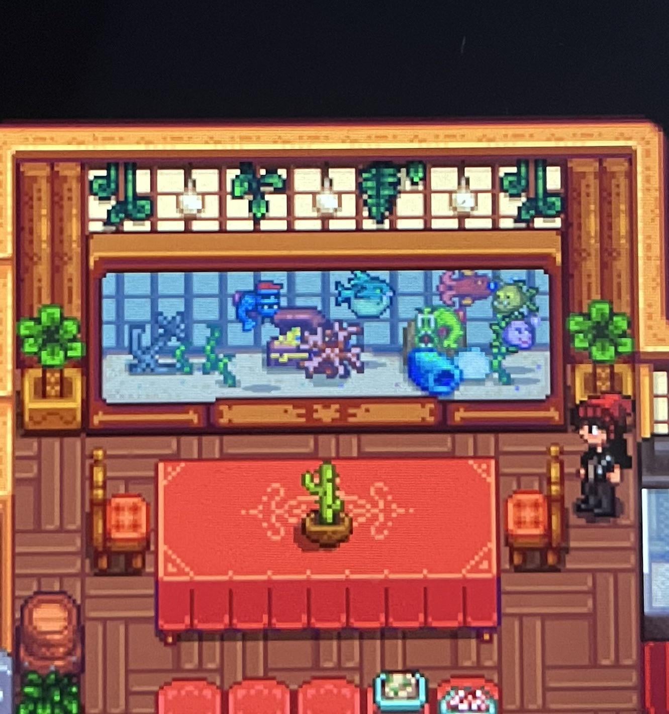 Ignore the random angler inside the tank, I forgot I put them there LMAO! Btw, do you guys like my restaurant themed kitchen? by anxious_meatball Stardew Valley