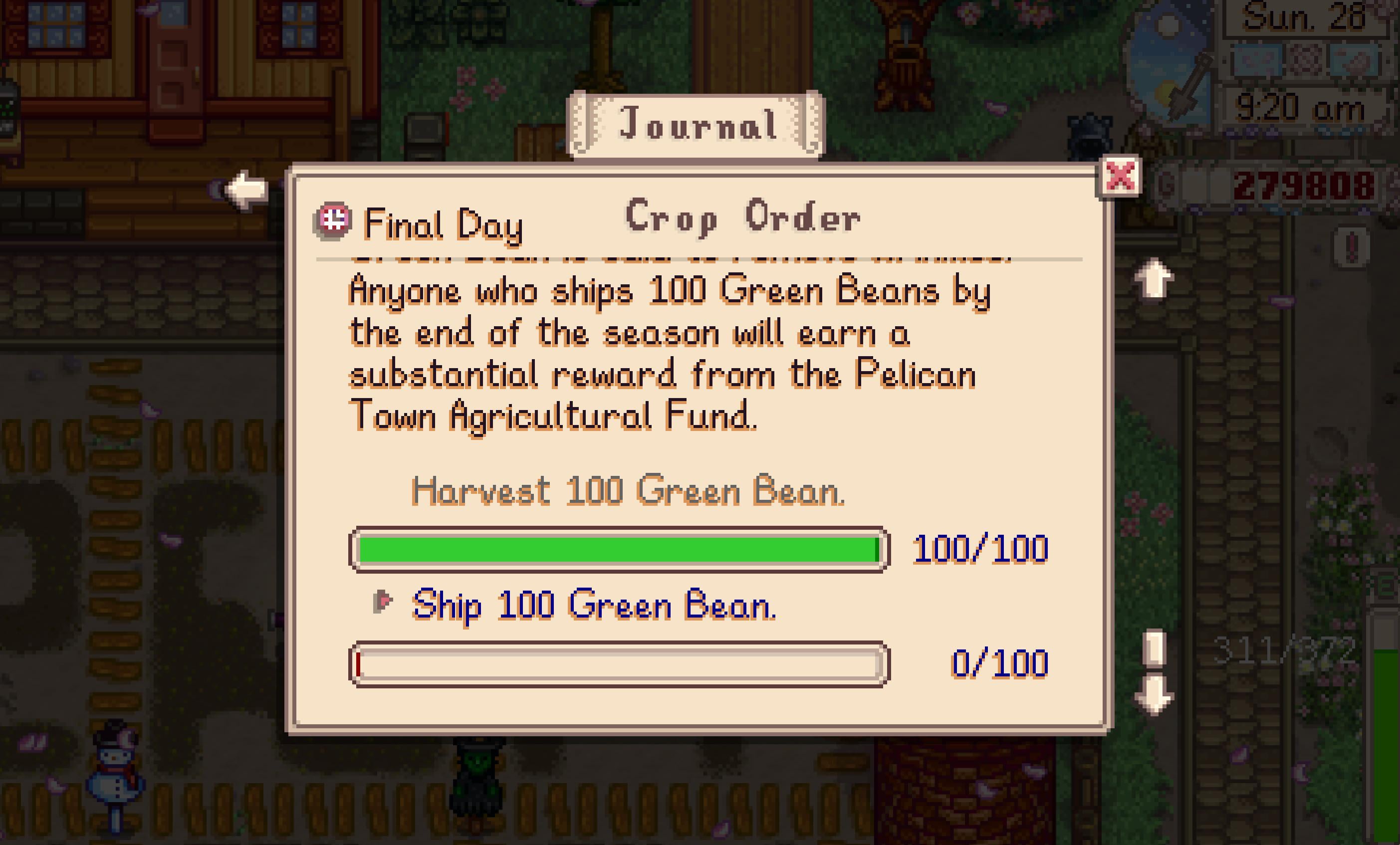 I didn’t realize that I needed to ship 100 green beans BEFORE today, I thought it wanted me to place it in a bin on the last day like the other quests. Now I gotta wait another whole year before I can complete this quest 😔😔