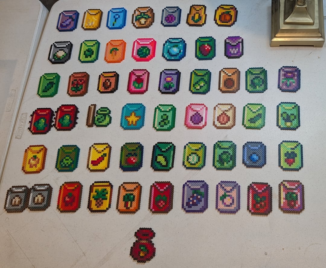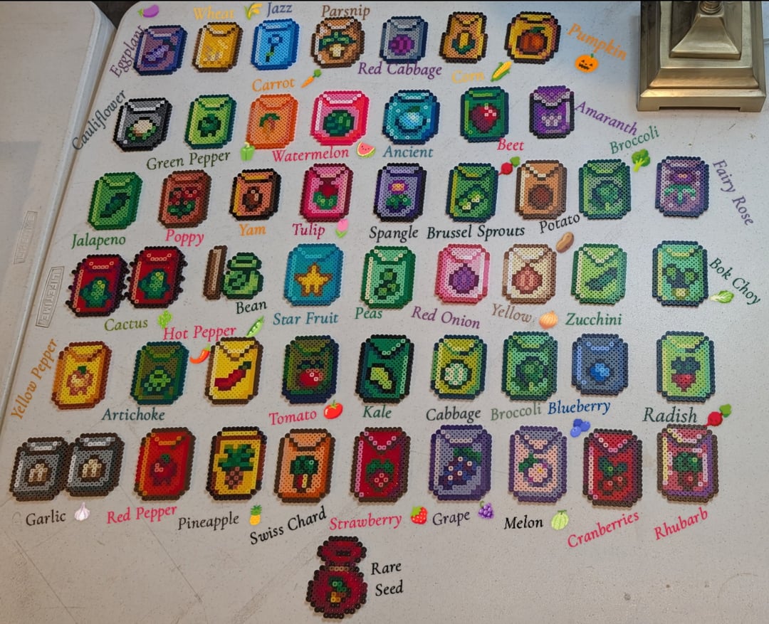 I made most of the Stardew Valley seed packs from the game! Please let me know what you think and which are your favorites 🙂 I did my best to color match with the colors I had 😝 by Cold_Cartoonist_9130 Stardew Valley