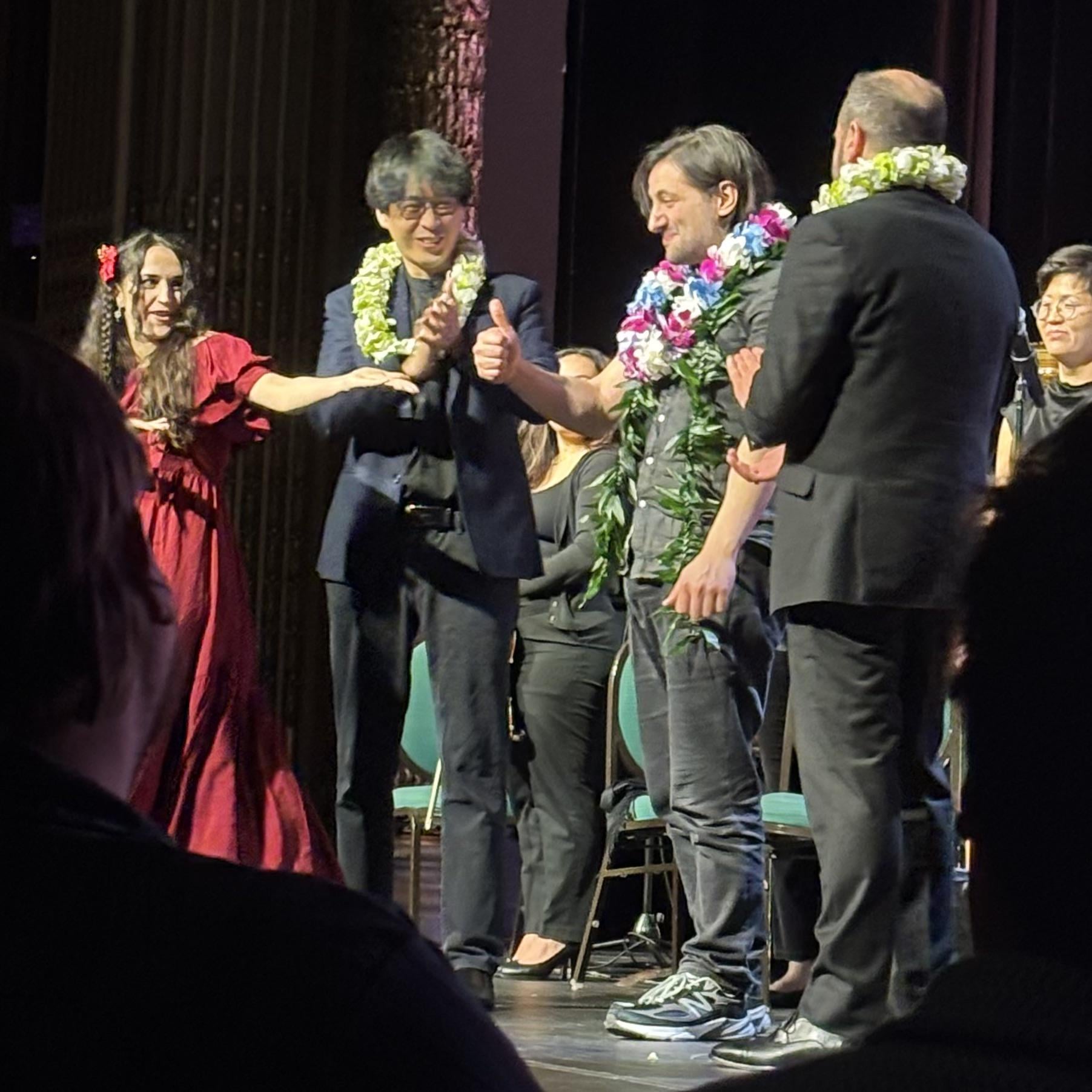 To the left of him is the man who actually transposed all the music to orchestral form (I can't remember his name at this moment and am having trouble finding it online, if anyone has it I'll update this!), he is Thai and this was his first time seeing the show outside of Asia! The concert was awesome of course, I'm really glad I got to get this pic of Concerned Ape's awkward thumbs up after getting lei'd lol