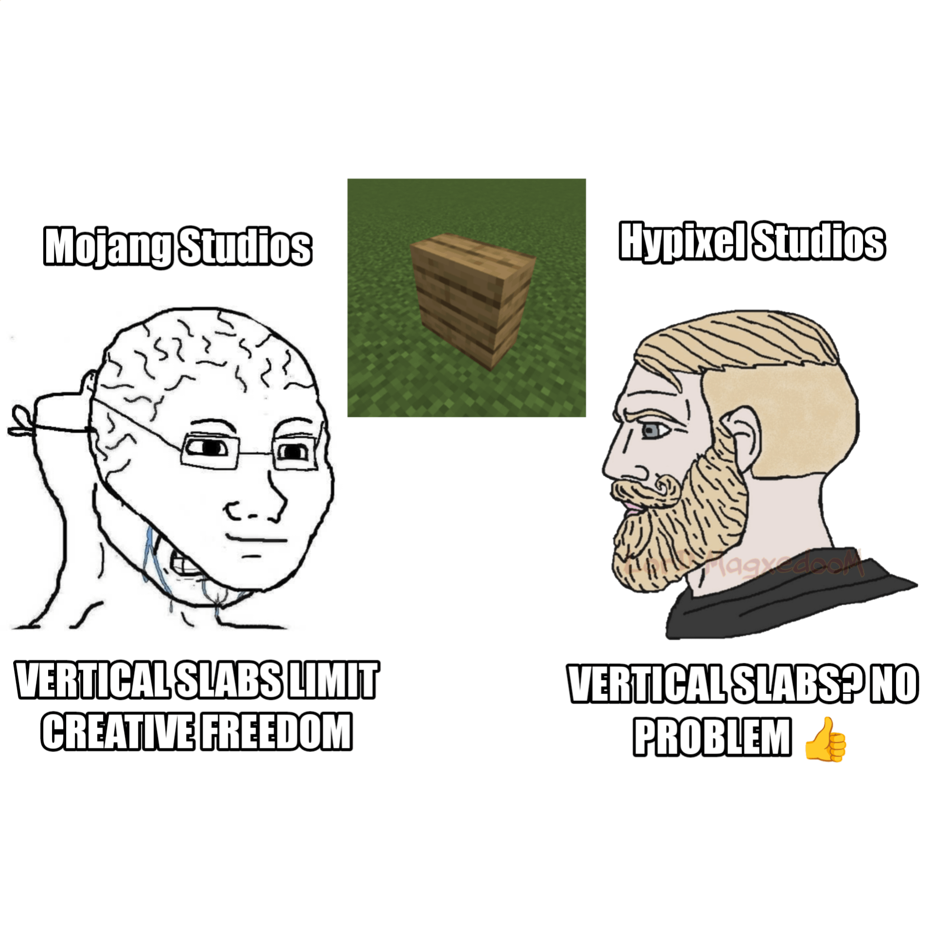 Another hot take: i don’t think vertial slab would fit the Minecraft’s building philosophy. When we need a set of block to thicken the wall abit, we use walls, fences, and recently shelf to build. When building with LEGO, there are certain things that we can’t achieve, and it’s OK, since the limitations are what make the experience unique. Vintage Story has the chiseling system, Hytale has vertical stabs and slanted roof, different sandbox games have different build style, so maybe we should accept that, instead of making post like this.