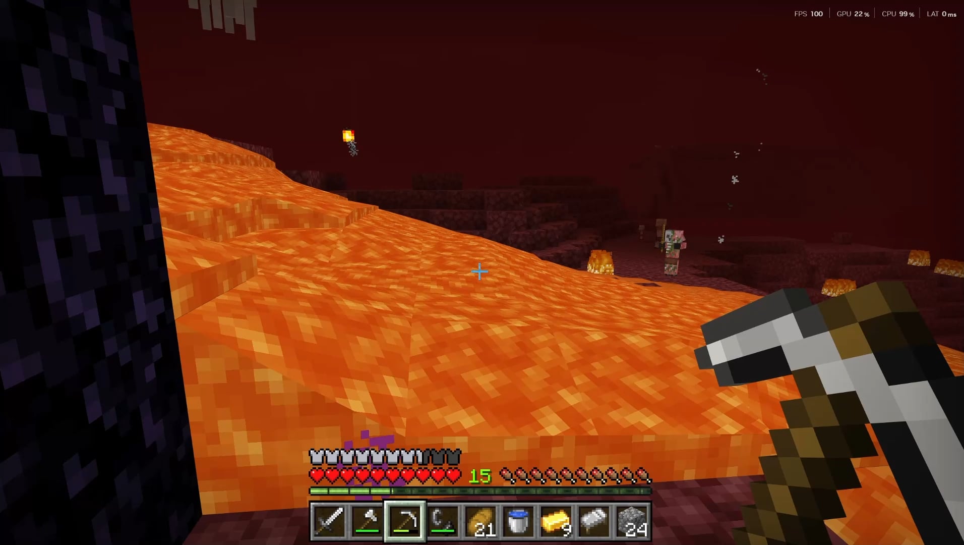 Cool seed because there is lava all around you in the nether. seed :-1450518493105977971 coordinates: 779, 77 -3587 you can find 7 obsidian at the village blacksmith next to it. (P.S. watch out, there is a ravine right in front of the portal, and you can't see it when you are going to it, so just go around. There is lava pouring from behind you, so you have to wait like 10 seconds for the scene.