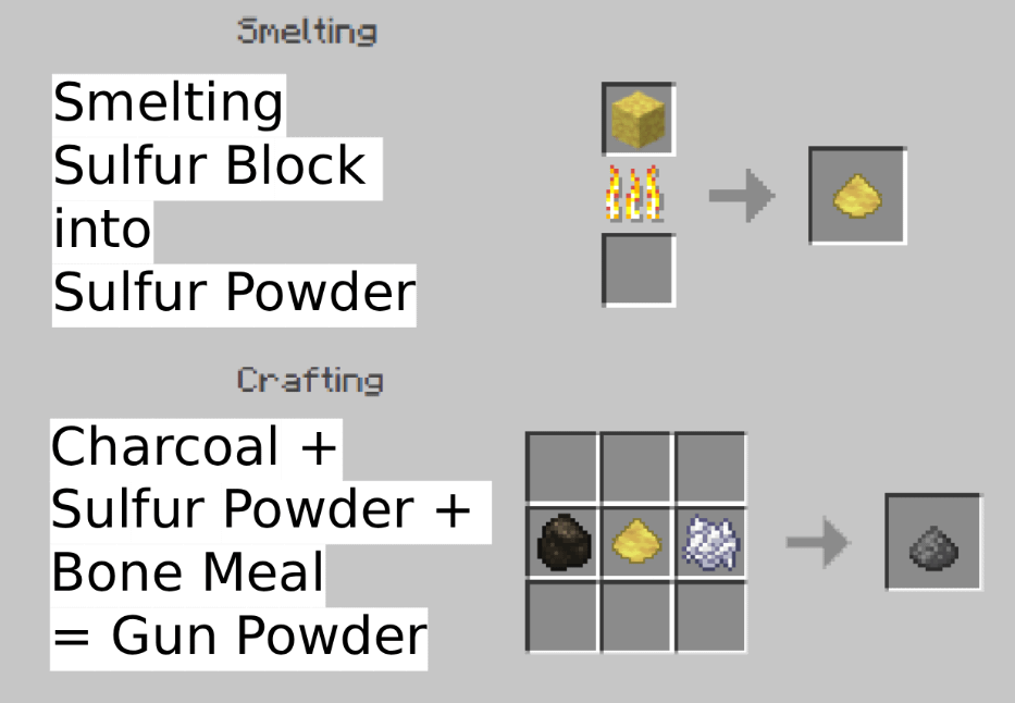 Craftable gunpower would be nice, but should need an extra step that isn't instantaneous; the furnace or the brewing stand could do.